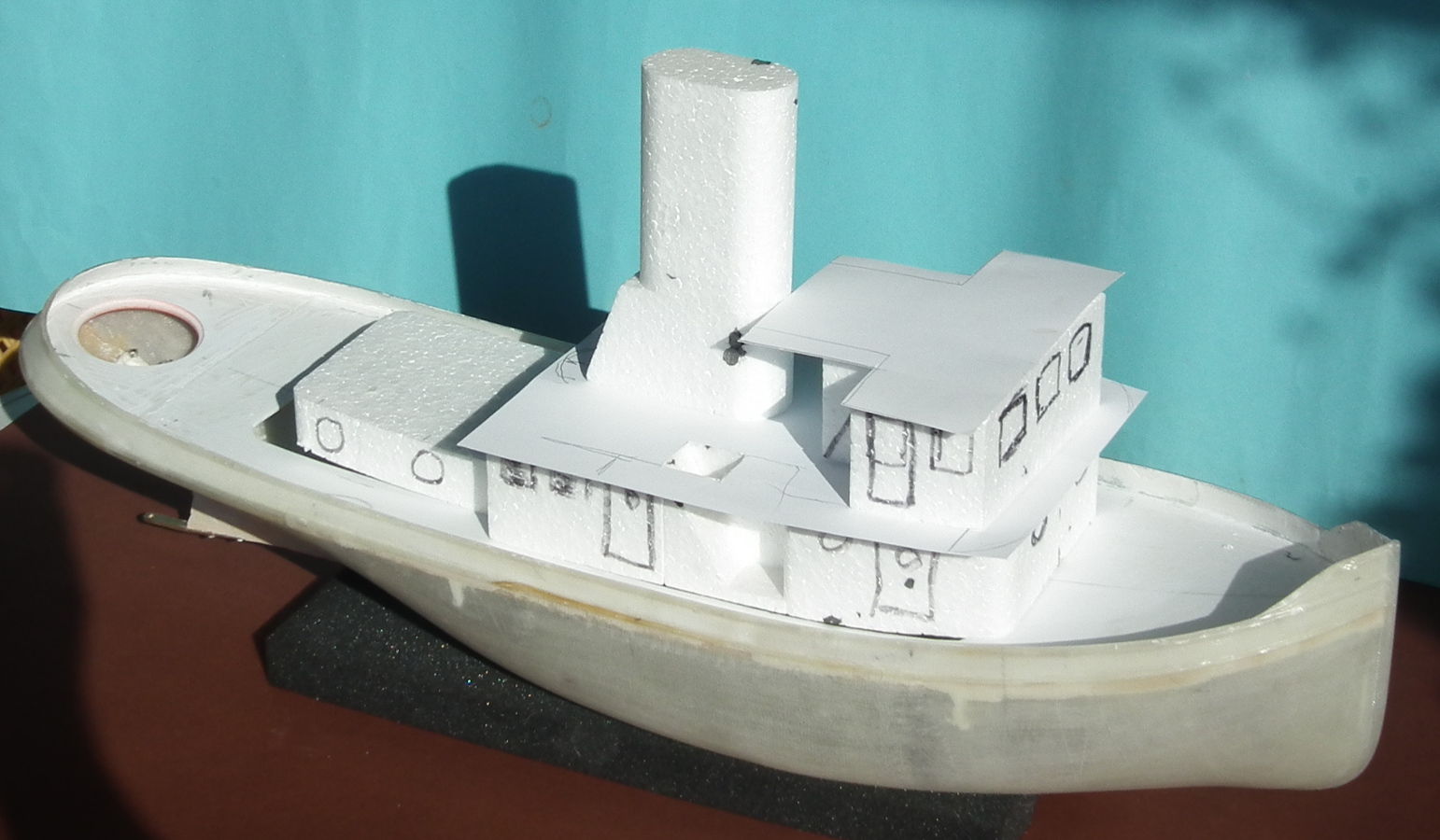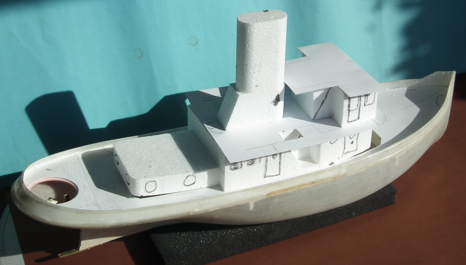 Całe nadbudówki są oklejone cienkim płótnem klejonym farbą akrylową rozcieńczoną wodą . Całość po oklejeniu uzyskuje sztywność i wytrzymałość . Nadmiar płótna usuwam skalpelem chirurgicznym , trzeba tylko pamiętać żeby nasączyć płótno trochę dalej niż krawędź styroduru .