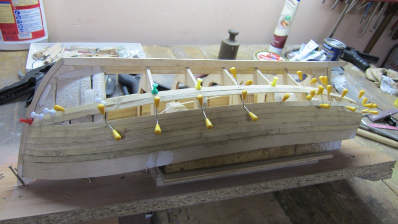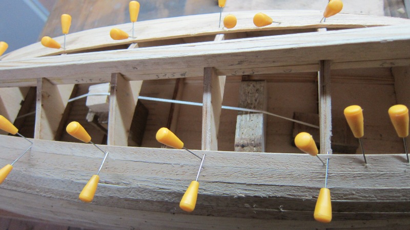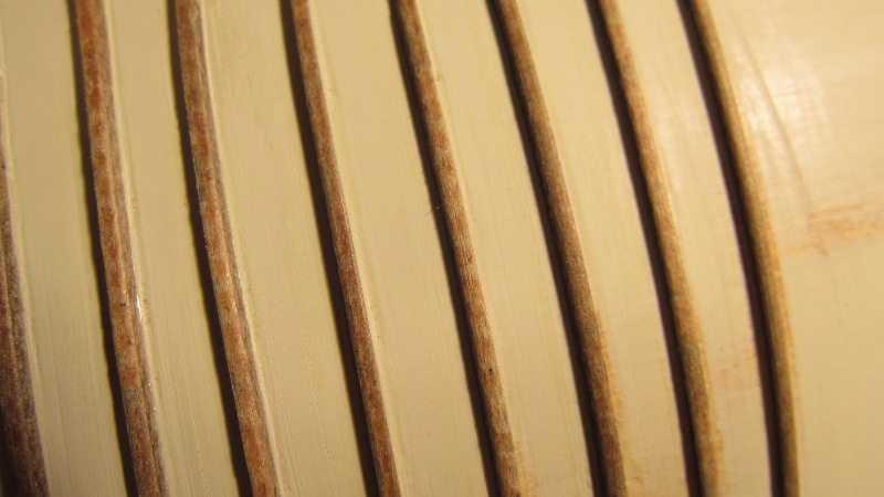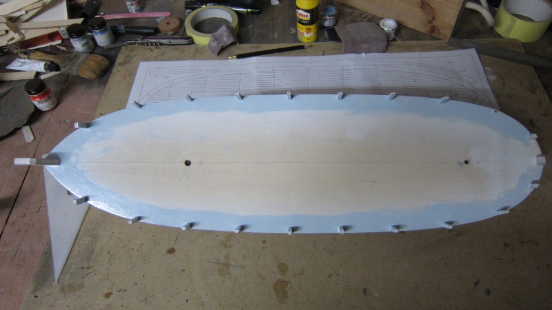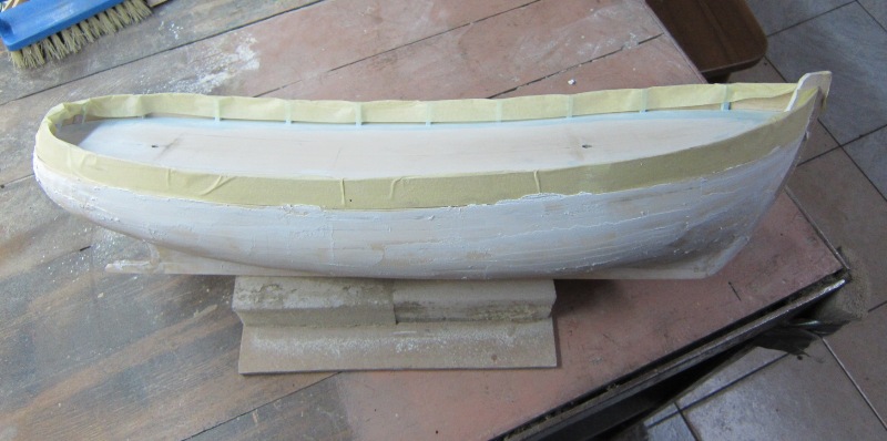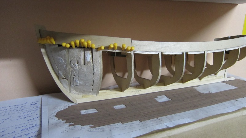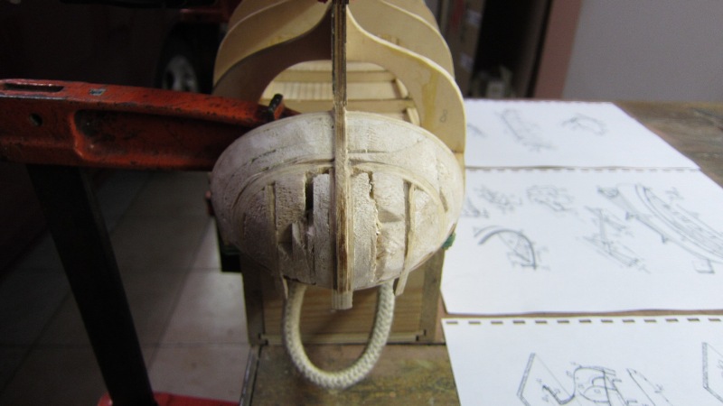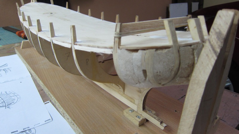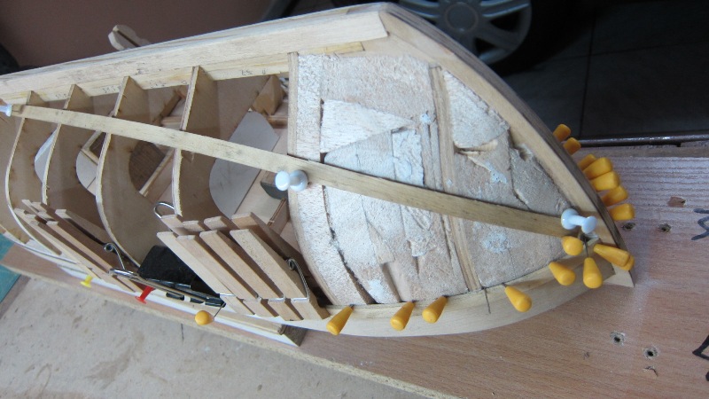 2. Przekonałem się do - podpowiadanego wielokrotnie - wypełniania części dziobowej i rufowej szkieletu miękkim drewnem w celu uzyskania poprawnego, bez załamań i spłaszczeń, kształtu kadłuba.