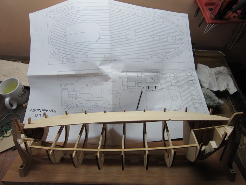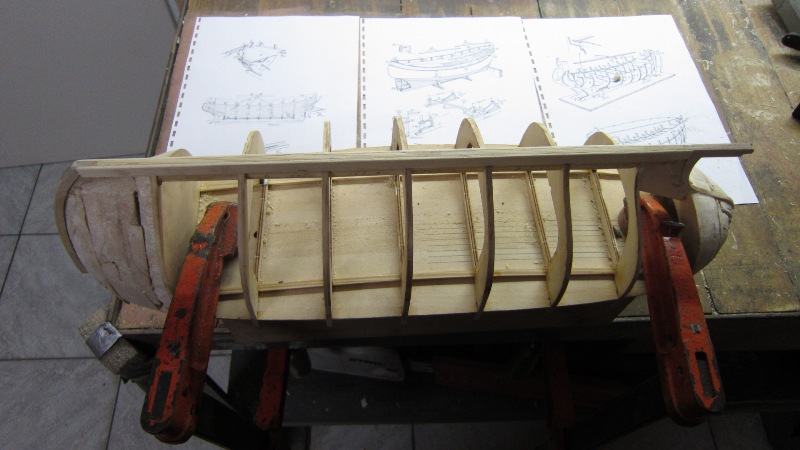 1. Bardzo ważne jest niedopuszczenie do zwichrowania szkieletu przy klejeniu poszycia. W tym modelu dobrym zabezpieczeniem jest wcześniejsze wmontowanie pokładu.