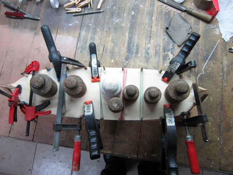 9. Przetestowałem kołkowanie pokładu. Do wiercenia otworów dobrze jest mieć szablon, lub chociaż twardą linijkę, o którą można oprzeć wiertło. Każdą wykałaczkę można wykorzystać do czterech otworów, ostrząc ją do kolejnego na szlifierce. Klejenie należy wykonywać z minimalną ilością kleju. Wciśnięta wykałaczka nie wypadnie, a nadmiar kleju wokół wciśniętego patyczka bardzo utrudnia późniejsze cyklinowanie.