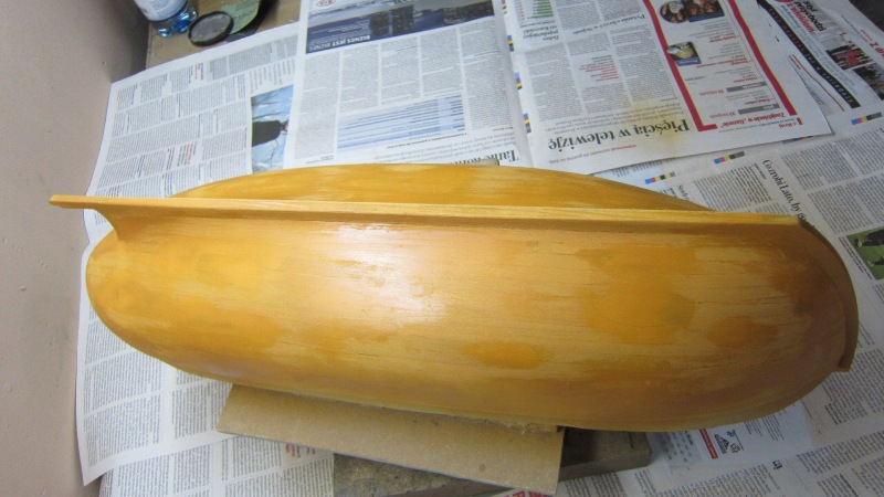 Witam. Przepraszam a mógłbyś bardziej szczegółowo opisać etap od momentu poszycia kadłuba listewkami do momentu który prezentujesz na zdjęciu? , a mianowicie czy impregnowałeś czymś listewki ?, szpachlowałeś ? (jeżeli tak to jaką szpachlą ), lakierowałeś (czym?) itp. tzn wszystko krok po kroku w tym temacie-jeżeli nie sprawi to problemu oczywiście. Pozdrawiam.