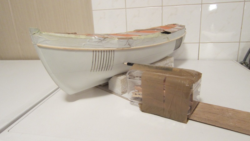 2. Przekonałem się do - podpowiadanego wielokrotnie - wypełniania części dziobowej i rufowej szkieletu miękkim drewnem w celu uzyskania poprawnego, bez załamań i spłaszczeń, kształtu kadłuba.
