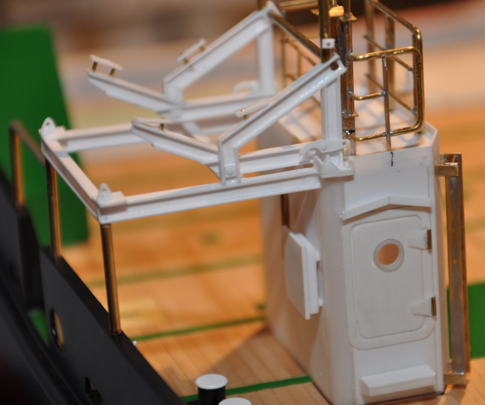W weekendzik sobie dokończyłem pomieszczenie na pokładzie. Rusztowanie zrobione z teowników 2x3mm. Zrobiłem je od ręki bo kurier dopiero by za tydzień dojechał pewnie. Ale myślę że źle nie wyszło. Samo pomieszczenie nie jest jeszcze doklejone więc na zdjęciu-2 wygląda na niedopasowane do deskowania. Oto efekty: