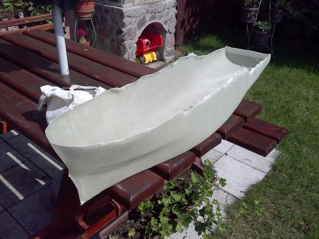 Wreszcie nadszedł poważny krok dalej w projekcie. Powstał kadłub z laminatu prosto z kopyta (bez formy), który sam wyprodukowałem. Skład laminatu: 4 warstwy płótna szklanego 140g/m2, 1 warstwa płótna szklanego 80g/m2, niecałe 0,5L żywicy epidian E53. Czas laminowania: ok 7h. Jako rozdzielacza użyłem 3 warstw pasty do butów nakładanych na gorąco. Laminat odchodził przepięknie. Teraz ruszają prace nad wymizianiem zewnętrznej części kadłuba, wzmocnieniem go za pomocą kilku wręg itd. Sztywność samego kadłuba jest zadowalająca, więc jeszcze będę rozważać czy wzmacniać kolejną porcją płótna od wewnątrz.