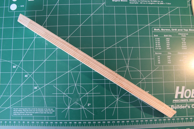 Grodzie będą się opierać na bazie wykonanej ze sklejki. Sklejka gruba i twarda więc nie było łatwo przy pomocy papieru ściernego i pilnika nadać odpowiedni kształt. Na bazie zaznaczony jest środek, który będzie stanowić orientację dla osi symetrii grodzi oraz prostopadle co jeden cal pozycje poszczególnych grodzi. Końce są ścięte dwustronnie do skosu w widoku z góry aby ułatwić montaż planek na krańcach modelu. W widoku z boku ścięcie stanowi przedłużenie stewy dziobowej i rufowej.