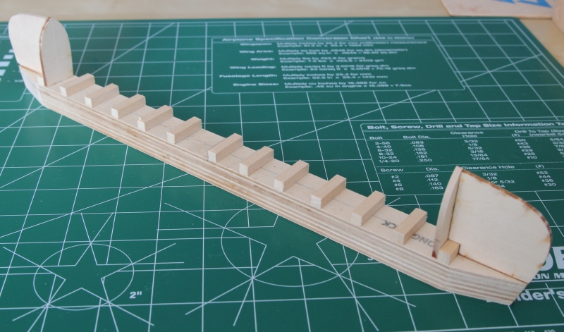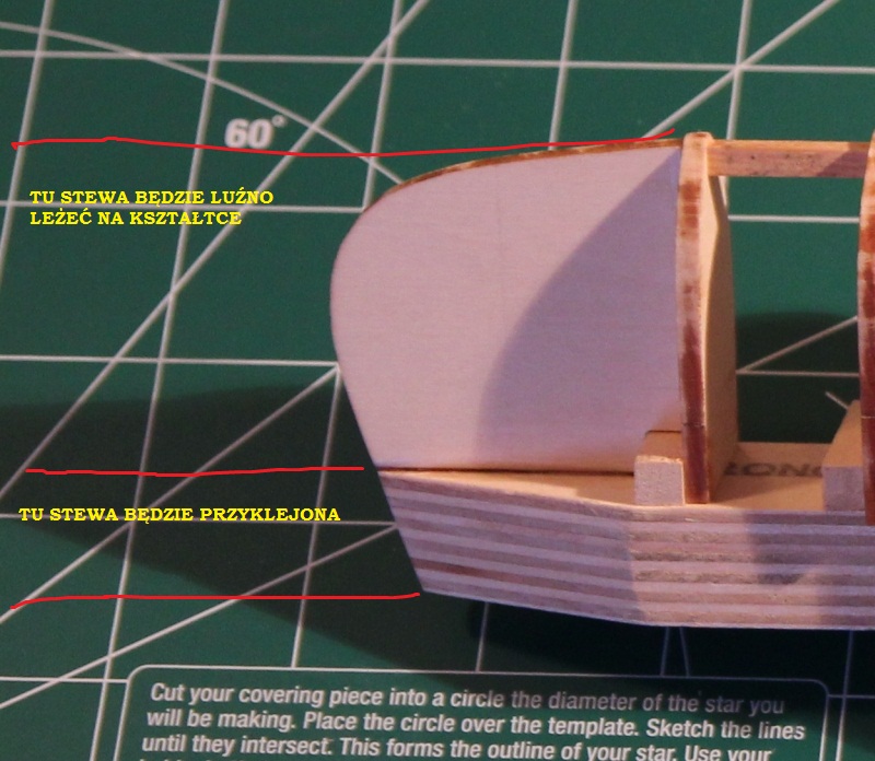 Łódka ma 4 stewy (wewnętrzne i zewnętrzne na rufę i dziób), które są zagięte po łuku przekraczającym 90 stopni. Aby łatwiej było wykonać takie wygięcie producent przewidział warstwową budowę. Do gięcia służą kształtki. Jedna była wycięta laserowo. Drugą trzeba było wyciąć samodzielnie. Obydwie są przybite do deseczki obciągniętej folią. Folia po to aby uniknąć przyklejenia stew do deseczki podczas klejenia.
