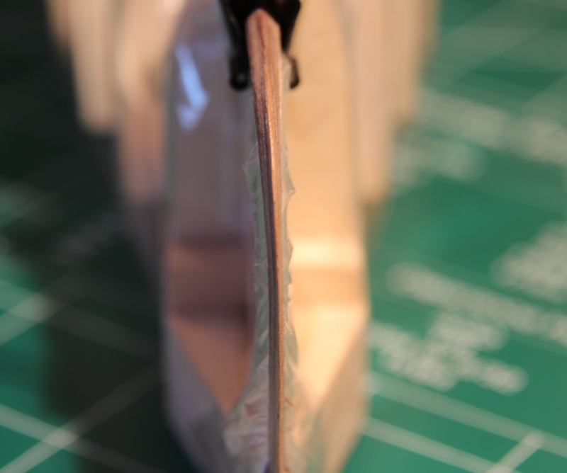 Następnie grodzie zostały zabezpieczone taśmą samoprzylepną aby zapobiec przyklejeniu do nich planek, które będą klejone jedynie między sobą. Konieczne też było zabezpieczenie kształtek, na których leżą stewy. W tym celu wsunąłem pod stewy bardzo cienką folię - paski wycięte z torebki śniadaniowej. To pozwoli bezpiecznie kleić planki do stew bez ryzyka przyklejenia do kształtki.
