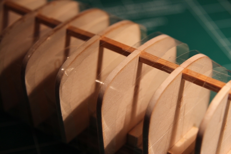 Przyklejone pozostałe grodzie. Dodałem listewki dystansujące od góry, które przyklejam na klej CA. Pomagało mi to złapać pion w osi poprzecznej, i bardziej ustabilizuje grodzie podczas dalszej pracy. potrzebne mi to zwłaszcza, że popełniłem błąd i naciąłem grodzie w miejscu linii poziomej wyznaczającej poziom poszycia. Chciałem aby linie te nie zacierały się, ale osłabiło to deskę i podczas klejenia jedna z grodzi się na tej linii przełamała. Udało się skleić, ale przyda się dodatkowa stabilizacja. Zwłaszcza podczas skosowania.