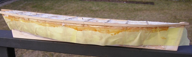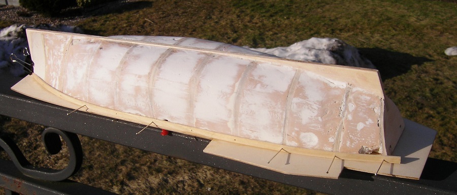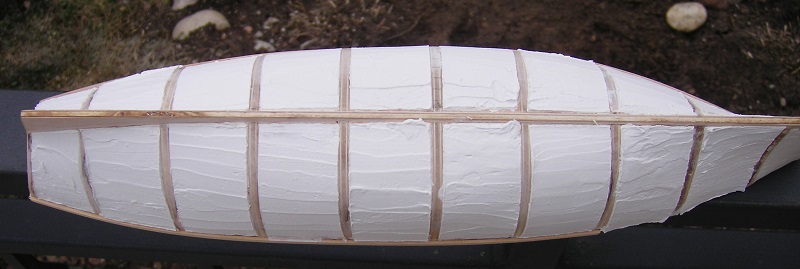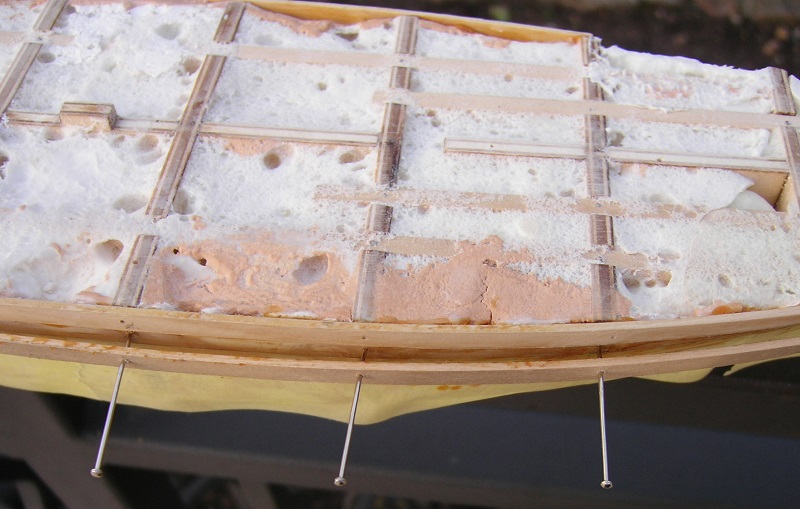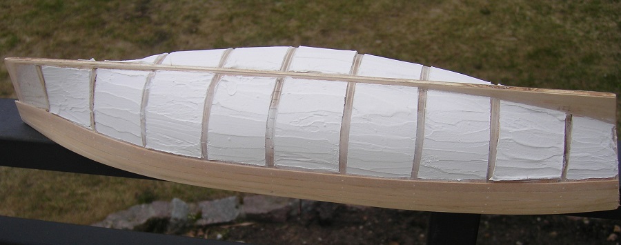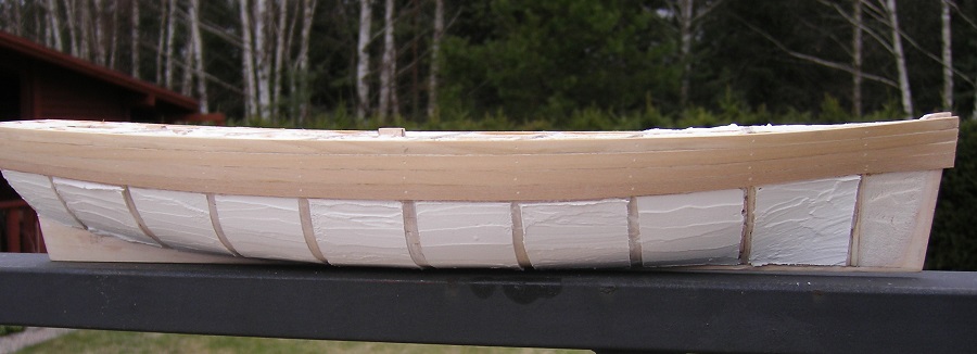 Trochę trudniejszy zarys kadłuba. Ten model wykonuję z zestawu, dlatego etap sklejania wyciętych laserowo elementów szkieletu pominę (jeden wieczór). Szkielet zapiankowany , nadmiar pianki obcięty i wstępnie przeszlifowany. Tu drobna uwaga – pianka , którą ja zastosowałem jest bardzo delikatna, nieuważny ucisk i ulega wgnieceniu. Po szpachlowaniu - niewiele się zmieniło w temacie twardości poszycia. Dlatego (niestety już po położeniu pierwszych planek) wprowadziłem poprawki. Piankę lekko ugniotłem ( tak to nie pomyłka – ugniotłem ją palcami, oczywiście z wyczuciem), potem posmarowałem klejem pattex fix i zanim klej całkowicie wysechł nałożyłem jeszcze raz szpachlę (gładź szpachlowa-pozostałość po remontach w domu). Wręgi wcześniej zakryłem taśmą malarską. Zanim szpachla wyschnie, zrywam taśmę. Wręgi na których głównie będą trzymać się planki są czyste i widać dokładnie do jakiego poziomu zeszlifować szpachlę. Powstała twarda skorupa (twarda , lekka ale dość krucha –podobnie do jajka) niepoddająca się tak łatwo, nawet dość znacznemu uciskowi. Całość czeka na szlifowanie. Planowane poszycie 2 warstwowe. Pierwsza warstwa 2 mm listewki z zestawu. Ponieważ jest to model treningowy, żeby nabrać doświadczenia, pierwsze poszycie będę starał się ułożyć starannie, zwężając planki na końcach. Na tym etapie, nie będę jeszcze starał się utrzymać symetrii planek po obu stronach kadłuba. Listewkę moczę, wyginam wstępnie w palcach, przykładam do kadłuba, nawiercam otwory 0,8 na wysokości każdej wręgi, przymocowuję szpilkami , moczę plankę wodą przy pomocy pędzelka i i przygrzewam lokówką do włosów "zapożyczoną" od żony