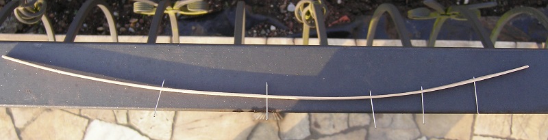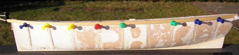 Po zdjęciu z kadłuba, listewka” zapamiętuje kształt”. Postanowiłem przyklejać planki butaprenem. Jego zaletą jest to że po dociśnięciu planka od razu jest przyklejona . Jego wadą to jest to ,że nie wybacza błędów, po przyłożeniu dwóch posmarowanych elementów nie da się ich przesunąć w stosunku do siebie. Czyli – na” jeden dotyk”. I dlatego szpilki w plankach posłużą jako prowadnice. Zdaję sobie sprawę , że przy poszyciu właściwym nie może być otworów i szpilek w plance. Otwory średnicy 1,0 nawiercone poniżej dolnego brzegu planki i zamocowane w nich szpilki (kolorowe na fotce) również spełnią podobną rolę, bez uszkodzenia planki , a dodatkowo można przy ich pomocy docisnąć plankę w newralgicznych pkt np. na dziobie. Tylko nie wiem jakie są jeszcze ukryte niespodzianki przy stosowaniu butaprenu zamiast pattexu expres. Może jedną stronę okleję butaprenem, drugą pattexem ? - wszak zadaniem tego modelu ( w moim przypadku) jest nauka i zdobywanie doświadczenia w stosowaniu różnych technik i materiałów.