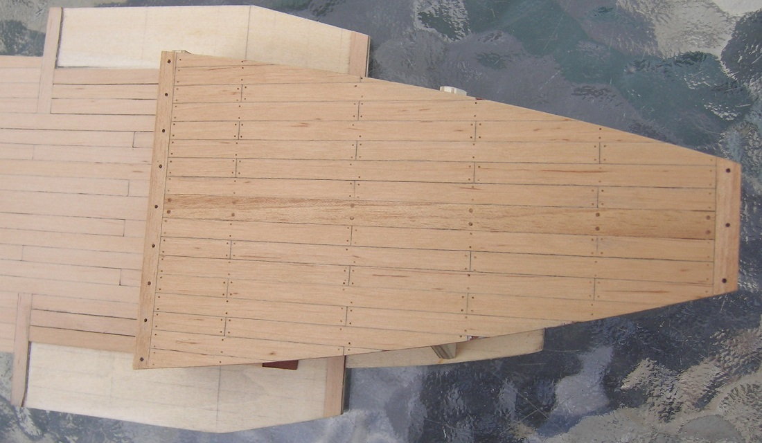 Witam. Dziękuje Panowie za podpowiedzi. Deskowanie pokładów zakończone. Dzięki uprzejmości Andrzeja Pierwszego stałem się posiadaczem wiertełek 0,3 i 0,4 mm. Kołki na górnym pokładzie średnicy 0,4 mm, „zakołkowane” pyłem uzyskanym z cyklinowanej na boku listewki, naniesionym na pokład przy pomocy szmatki nasączonej caponem. Brązowe średnicy 0,8 mm zakołkowane z listewki orzecha.