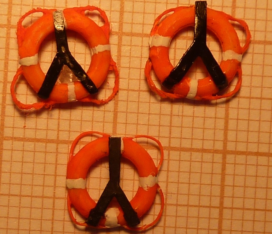 Nie wiem jakiej średnicy, jak małe są te koła ratunkowe i czy to możliwe bo ja tych pasków nie maluję tylko owijam paskiem białej foli samoprzylepnej. Koła oczywiście większe. Uchwyty jednak z blachy aluminiowej a najcieńszą biorę z dyskietki.