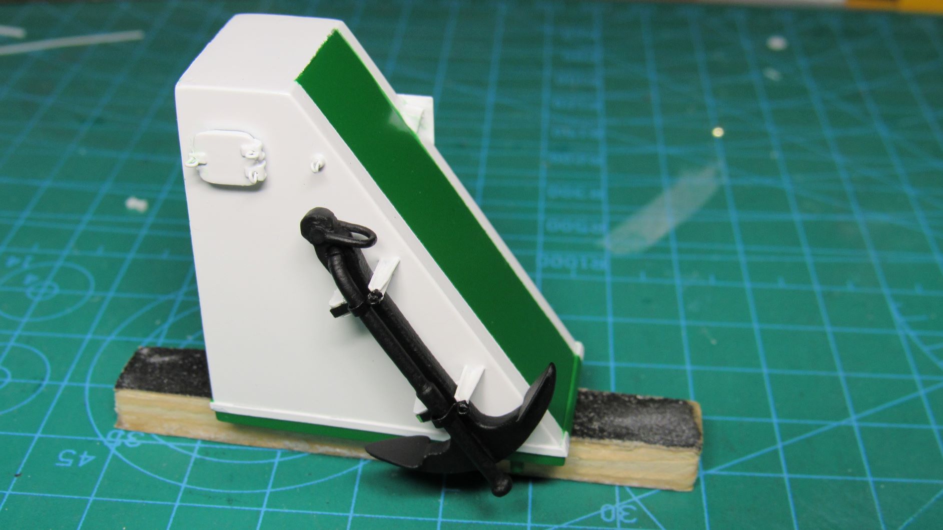 , cała kotwica jest wycięta piłką włośnicową z HIPS-a , nawet poprzeczka z odpowiedniej średnicy pręta i rurki wygięta na ciepło. Było trochę piłowania, szpachlowania i to wszystko. Jedyny metalowy element to szekla
