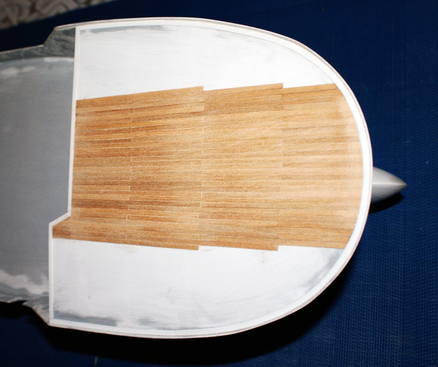Poszywanie pokładu dziobowego. Poszycie robię z czereśni amerykańskiej, szerokość "deseczek" - 3 mm.
