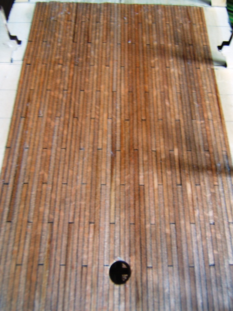 Deskowanie pokładu rufowego. Z nadburciami był mały kłopot, ponieważ miały strukturę maty. Wymagało by to szpachlowania, szlifowania a efekt byłby niepewny. Za radą Rychenki, okleiłem je hipsem 0,25 mm i po kłopocie