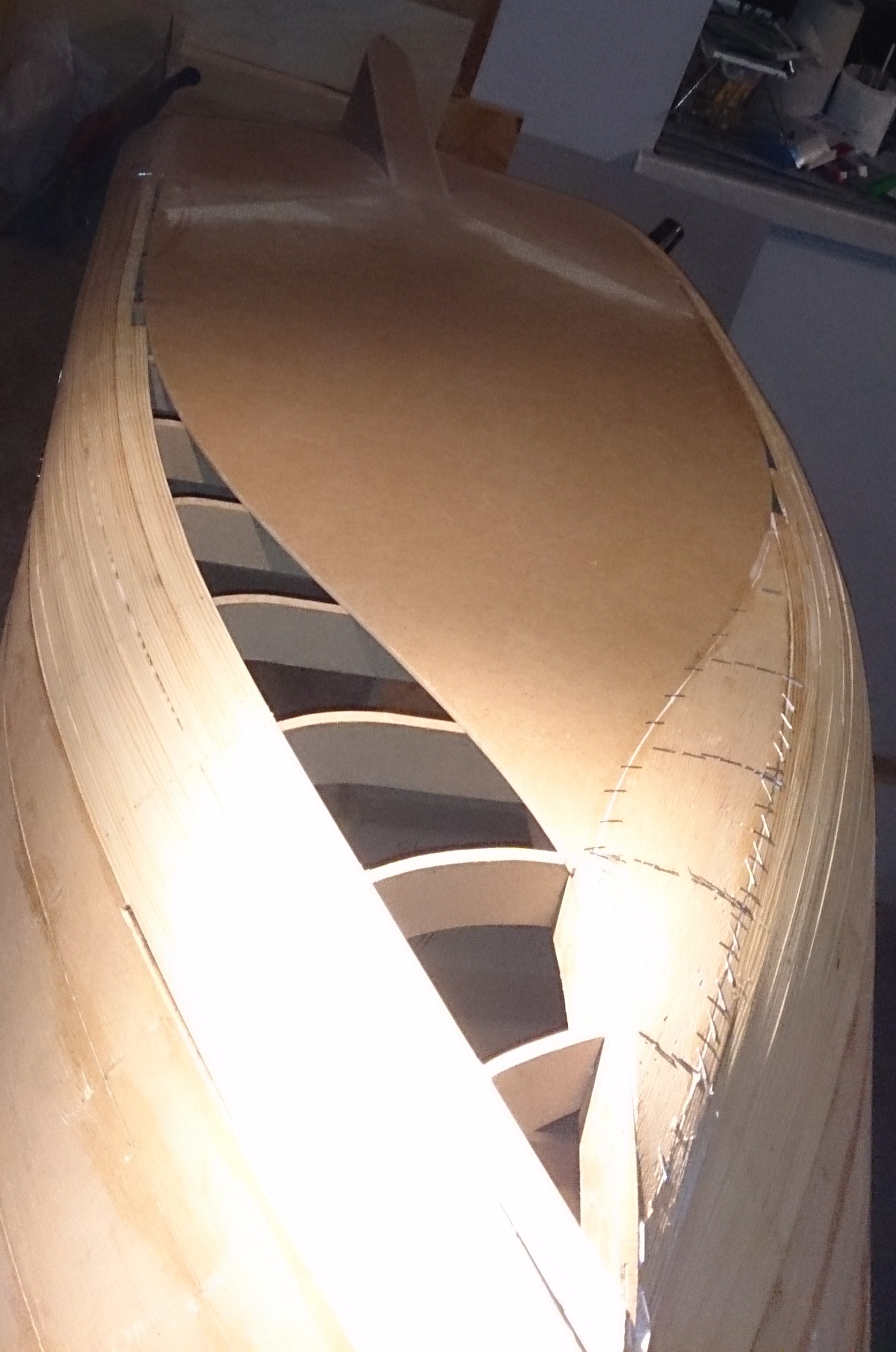 Kadłub już całkowicie poszyty i wyszlifowany i pozostało wypełnienie i doszlifowanie samego dziobu a teraz zacząłem prace przy nadbudówce.