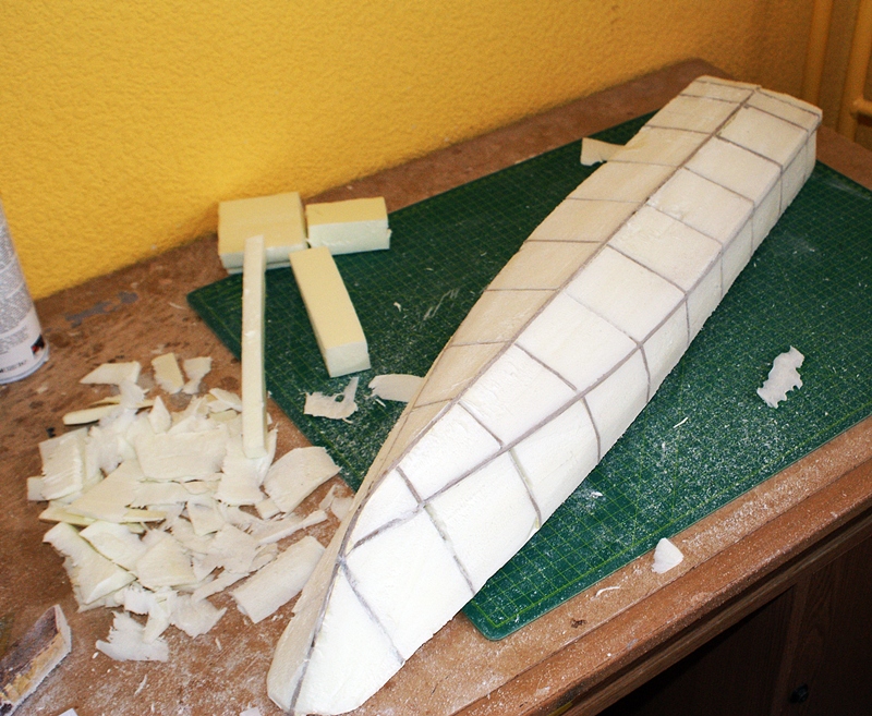 Sławku, przede wszystkim serdeczne dzięki za mnóstwo fotek, które mi przysłałeś na maila. To co do tej pory zrobiłem, to tylko podstawowa bryła kadłuba, pozbawiona wystających elementów, co bardzo ułatwia szlifowanie i wyprowadzenie kształtu. Cała reszta, wraz z wystającym pokładem jest jeszcze do zrobienia.