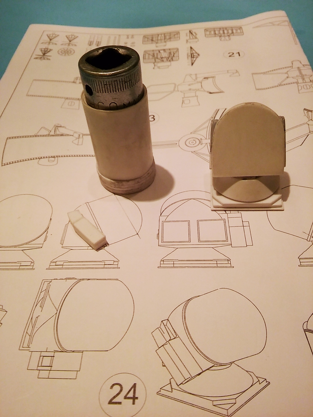 Powstają elementy do radaru. Kopułę zrobiłem nawijając na tulejkę hips 0.25 mm i naklejając od czoła krążki polistyrenu, które trzeba przetoczyć na tokarce. Korpus sklejony został z HIPSa 1 mm i 0.5 mm.