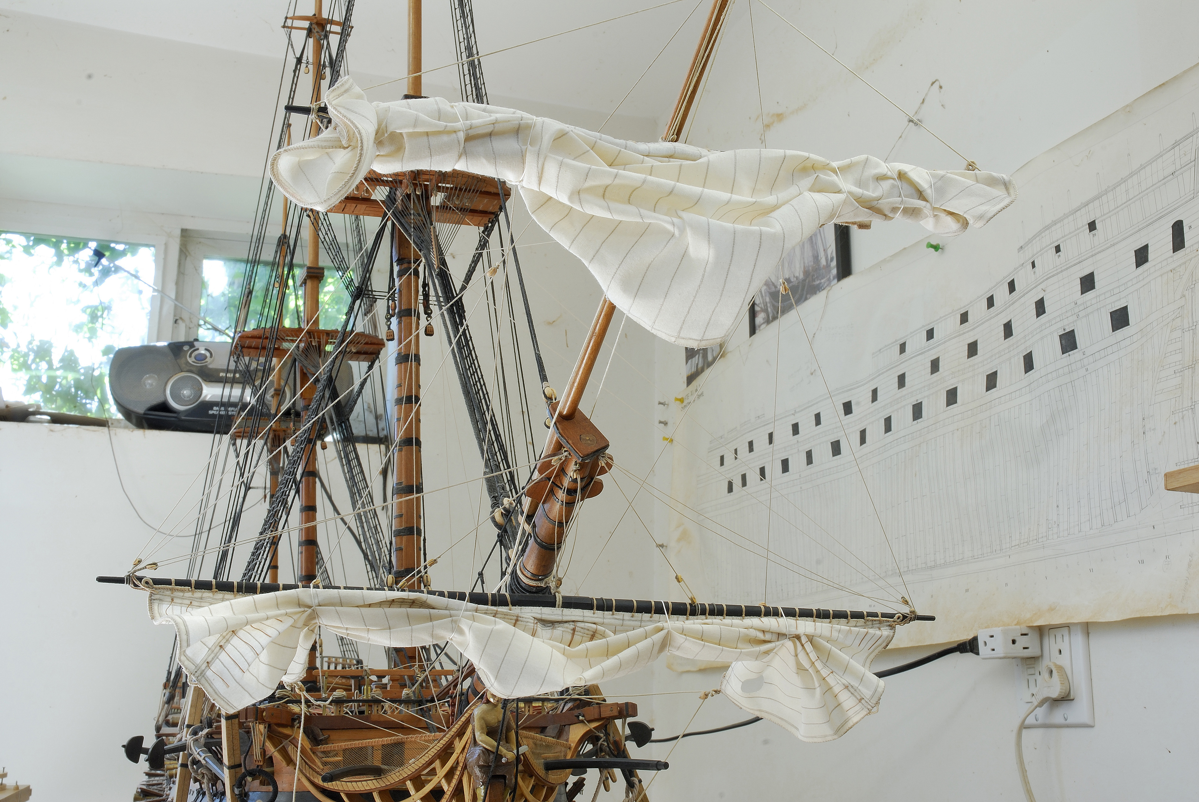 Do tej pory udalo mi sie zamontowac dwa zagle na bukszprycie, ze wszystkim im przynaleznym takielunkiem. Teraz pracuje nad trzema zaglami od foka, a potem przyjdzie kolej na grota, itd... W dalszej kolejnosci zajme sie trojkatnymi zaglami lacinskimi na sztagach, tzw. fore-and-aft sails.