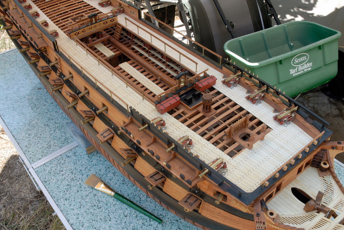 Olinowanie od dzial jest przyklejone do pokladow rozrzedzonym w wodzie pol-na-pol bialym klejem Elmer's, po wstepnym uformowaniu biegu lin. Oczywista, trzeba najpierw zdrapac miejsce przyklejenia z oleju do surowego drewna tak, aby klej chwycil. Zanim klej wyschnie, trzeba linki tam przytrzymac np. koncem wykalaczki czy innego cieniutkiego patyczka, np. od szaszlykow - trwa to kilka minut. Rozrzedzony klej po wyschnieciu jest praktycznie niewidoczny...