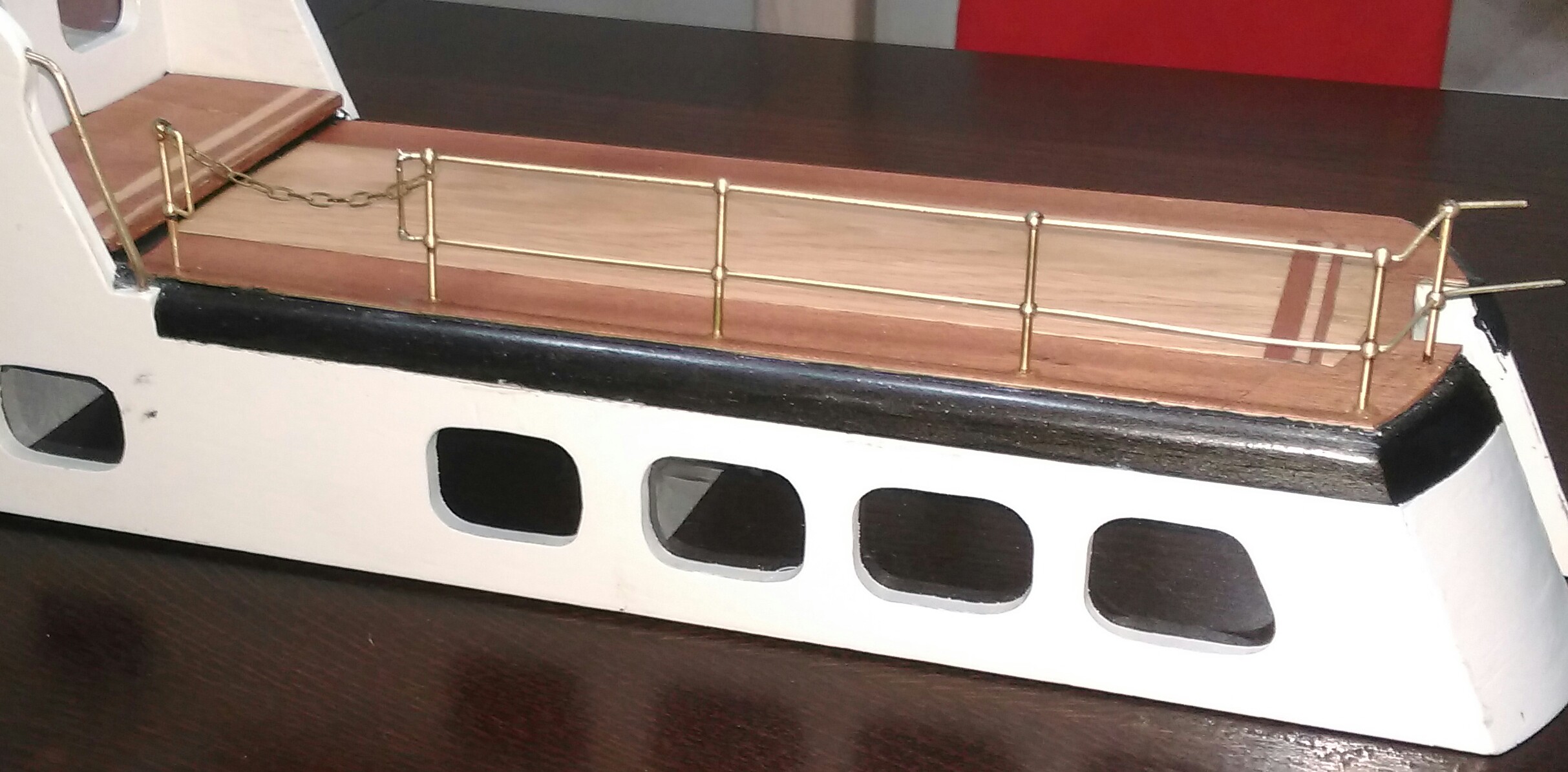 Proponuję zmianę charakteru tego modelu. Jak na statek wycieczkowy to takie relingi, barierki są mało bezpieczne i chyba będą dookoła. Słupki z pręta lub z rurki. Końcówkę sklep, wywierć otwór i opiłuj. Przez otwory cienka linka od roweru. Jak dojdą ławeczki i pasażerowie z przodu to sternik ze sterówki będzie miał widok zerowy. Wyżej za sterówką lepiej ale sternik będzie uciekał przed deszczem. Jaszcze schodki między pokładami. I coś mi się wydaje, że deski pokładu powinny być w burcie a nie na burcie.