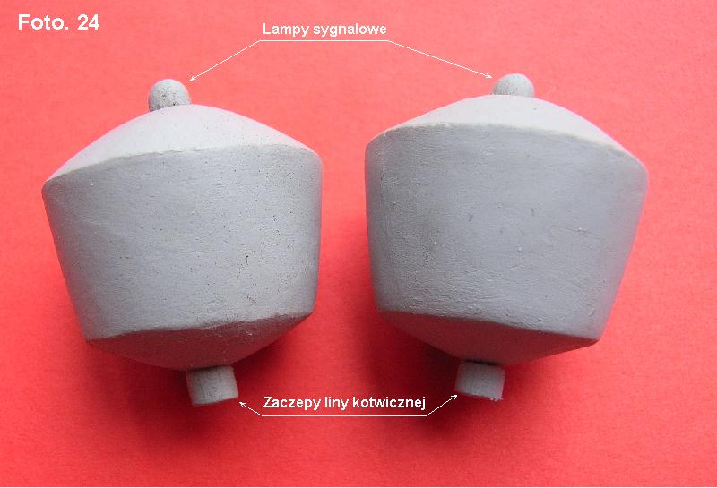 Po wykonaniu drugiej bojki przykleiłem na górze kopułki imitujące lampy sygnałowe, a na dole zaczepy liny kotwicznej. Szpachluje, szlifuje, maluje je farbą podkładową. Oglądam czy powierzchnie są gładkie, jeżeli nie to powtarzam procedurę szpachlowania od nowa. Tak przygotowane bojki przedstawione na foto. 24 odkładam na półkę do momentu kiedy przyjdzie czas dalszej ich obróbki.
