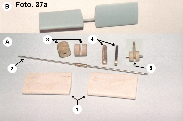 W segmencie A przedstawione są elementy kompletu tych sterów. Wskaźnik [1] przedstawia płetwy tuż przed malowaniem farbą podkładową. [2] Przedstawia właściwą oś. Oś ta ze względów technicznych nie została wykonana jako całość, lecz z trzech osobnych elementów. Grubsza część osi, która będzie się znajdować w tulei jest nawiercona osiowo z obu stron i ma wykonany gwint wewnętrzny. Poza tym ten element ma nawiercony otwór fi 1mm prostopadle do osi w środku jej długości. Dwa cieńsze elementy mają na jednym końcu nacięty gwint zewnętrzny i są wkręcone w element grubszy tworząc całość. [3] Przedstawia tuleję osi, która jest wykonana z drewna bukowego. Otwór osiowy jest równy średnicy zgrubienia osi. Ta tuleja w połowie swojej długości ma wyfrezowaną szczelinę na głębokość 3mm poniżej nawierconego otworu osiowego. [4] Pokazuje dźwignię osi. Dźwignia ta jest wykonana z płaskownika mosiężnego w kształcie ostrego trapezu z zaokrąglonymi podstawami. Na pierwszym rzucie widać nawiercone dwa otwory. Górny o średnicy 1,5mm i w nim będzie zamontowany popychacz wychylenia sterów. Dolny otwór ma średnicę równą średnicy grubszego elementu osi. [5] Pokazuje złożenie elementów osi, a strzałka wskazuje na otwór wywiercony w dźwigni [taka ciemna kropka] taki sam jak w zgrubieniu osi, w który będzie wciśnięty bolec unieruchamiający dźwignię na osi.