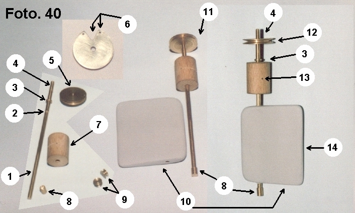 Wskaźnik [1] pokazuje oś steru. [2] Pokazuje miejsce wyfrezowanego rowka. [3] Wytoczony kołnierz oporowy, a wskaźnik [4] nacięty gwint na długości kilkunastu milimetrów. [5] Krążek, z którego został wykonany kwadrant. [6] Przedstawia kwadrant i jego elementy tzn. wycięty wycinek koła i na jego krańcach wywiercone dwa otwory fi 1mm na bolczyki do zamocowania linki. [7] Przedstawia tuleję trzonu steru z drewna bukowego. [8] Tulejkę oporową stopy trzonu, czyli ślepą a nie przelotową. [9] Dwie z kilkunastu rolek [bloczków] do prowadzenia linki. [10] To płetwa steru. [11] i [14] złożone elementy steru. [12] Pokazuj wyfrezowany rowek kwadrantu, w którym ułożona będzie linka. [13] Strzałka pokazuje czarny punkcik na tulei. To jest właśnie nawiercony otwór, w który zostanie wciśnięty bolec wchodzący w rowek osi.