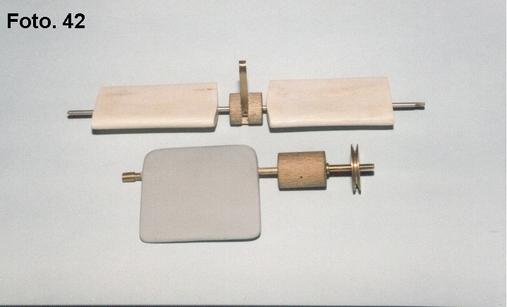 Foto. 42 Przedstawia rufowy ster głębokości i ster kierunku w postaci złożonej, brak jest jednak widoku złożenia sterów dziobowych – zabrakło miejsca na filmie, ale można to sobie wyobrazić patrząc na roboczą Foto. 38 w segmencie D. Tuleja drewniana, a właściwie klocek prostokątny elementu środkowego też będzie wykonany z drewna bukowego. W końcowej fazie będzie przyklejony po bokach do burt kadłuba, a od góry do pokładu.