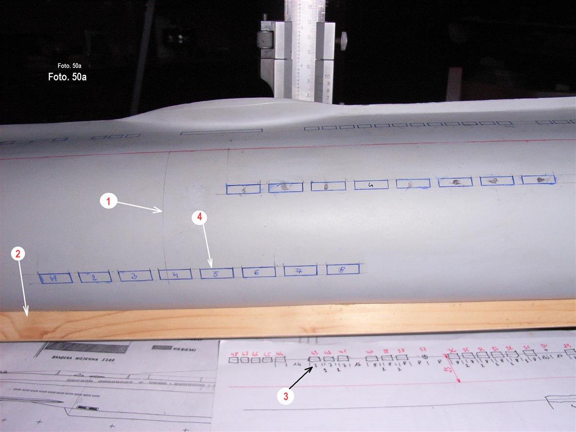 Foto. 50a. Przedstawia fragment kadłuba z wytrasowanymi otworami burtowymi i dennymi. Wskazanie [1] pokazuje, którąś z kolei pionową linię bazową. [2] To kil [stępka]. [3] Rozrysowane pomiary do przeniesienia na kadłub. [4] Wytrasowane otwory denne. Wszystkie prostokąty nie są właściwymi otworami. Są to graniczne linie długości i szerokości owalnych otworów, których kształt ostateczny widać na foto. 49. Otwory okrągłe na kadłubie nie są narysowane. Ich umiejscowienie jest zaznaczone tylko kropką [oś otworu]. Te otwory będą wiercone wiertłem o właściwym rozmiarze otworu.