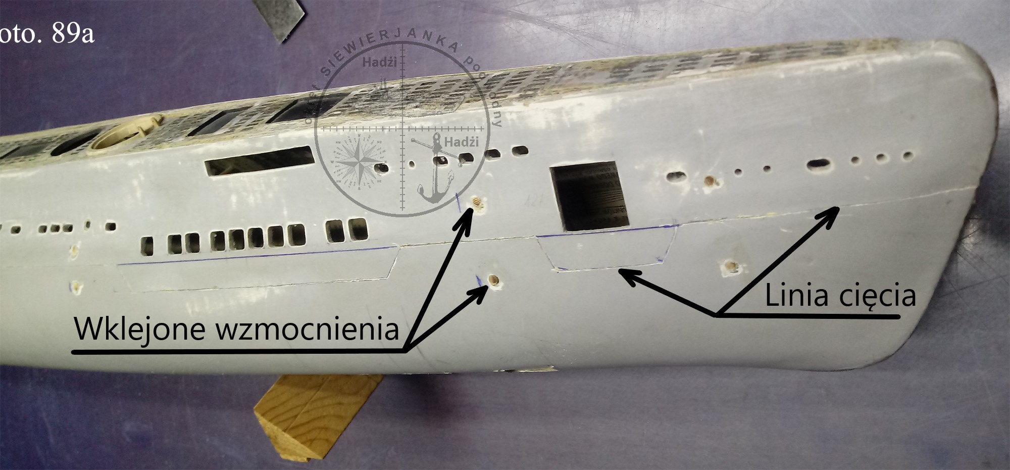 Nie jestem pewien czy po rozcięciu skorupy kadłuba wzdłuż linii KLW ona nie zmieni swego kształtu. Wolę nie ryzykować. Nawierciłem, więc otwory nad linią i pod linią na obu burtach. Wkleiłem w nie patyki szaszłykowe.