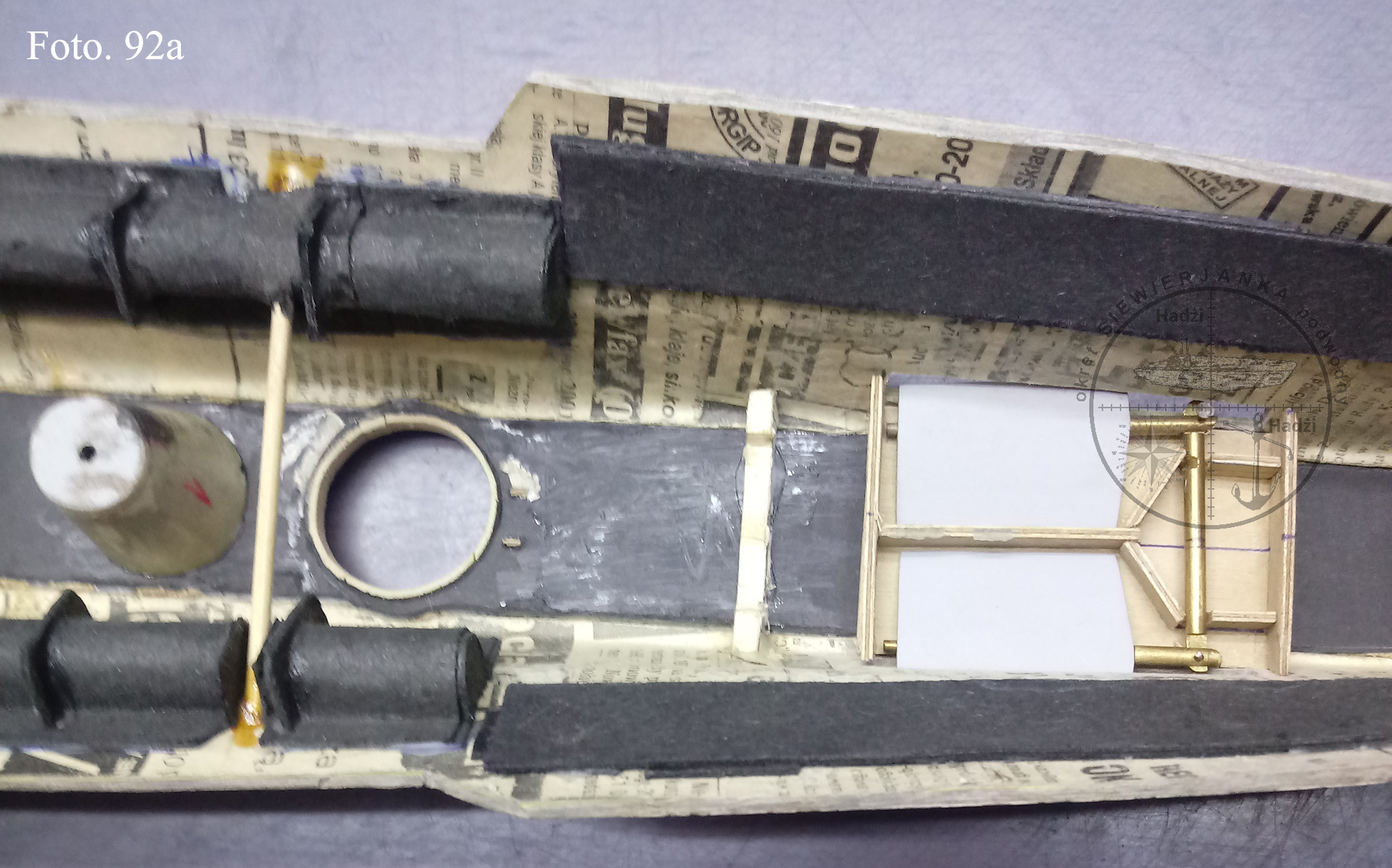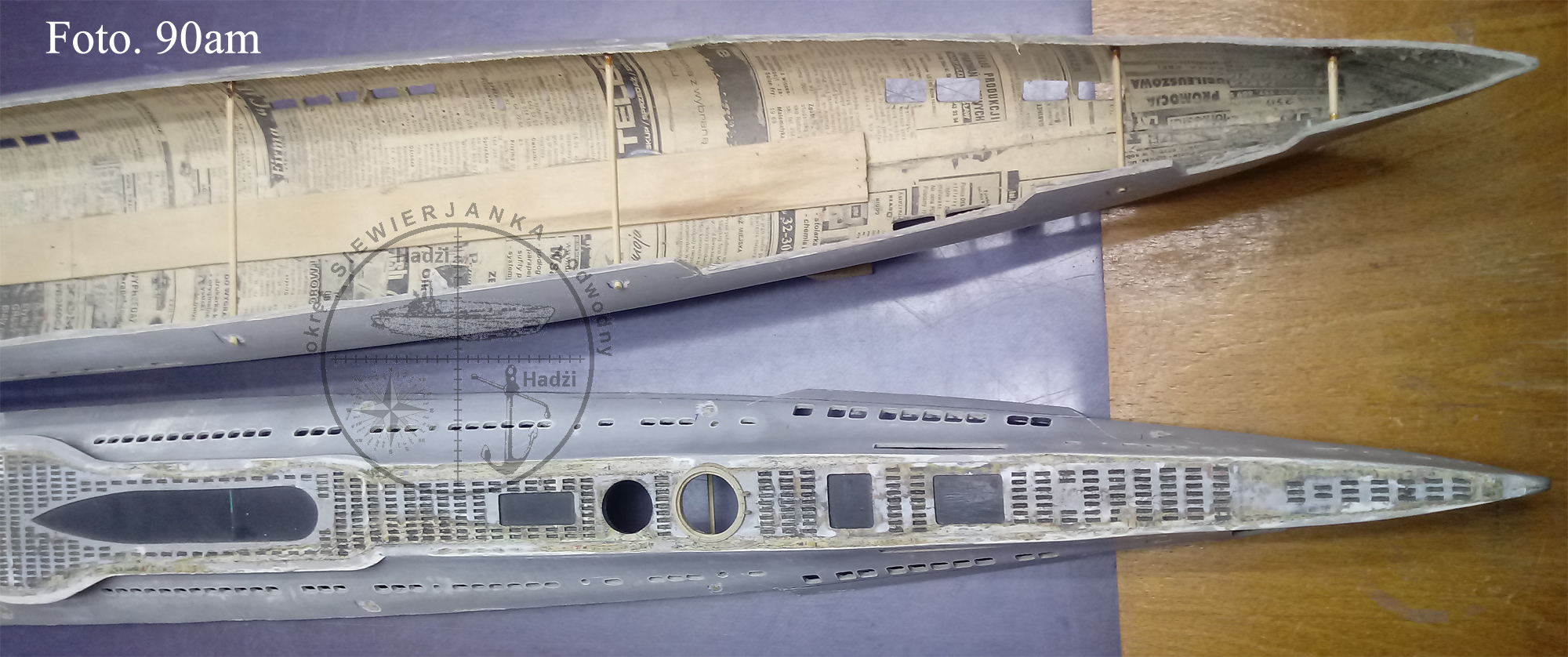 W odciętej nawodnej części kadłuba zostały wklejone uprzednio wykonane kanały szasowania balastów. Wklejone zostały też dziobowy i rufowy luk boi ratunkowych. Pozostało jeszcze do wklejenia kluza kotwiczna i kaseta dziobowych sterów głębokości. Część dziobowa przedstawia się tak: A rufowa tak: W części śródokręcia są wklejone kanały tak jak w dziobowej i rufowej.