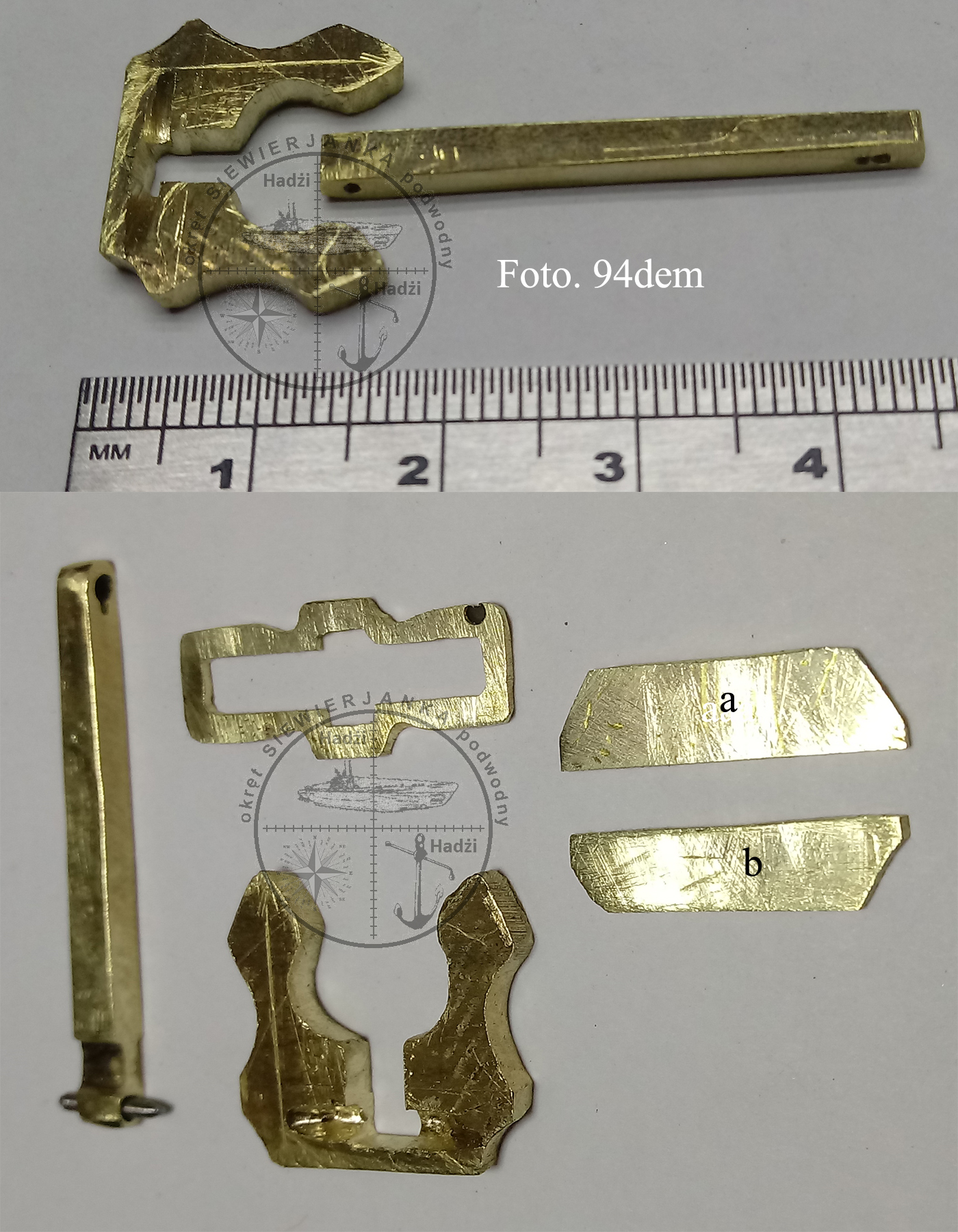 Kotwicę wykonuję z blach mosiężnych. Składa się na nią sześć elementów. Trzon tej kotwicy jest ruchomy. Najwięcej kłopotu przysporzyło mi przewiercenie otworu w trzonie na oś i otworu pod szeklę. Otwory wierciłem ręcznie przy pomocy walka giętkiego wiertłem fi 1 mm. Następną trudnością było umiejscowienie osi i podszlifowanie elementów tak, aby łapy wychylały się pod odpowiednim kątem w jedną i drugą stronę. Elementy składowe przedstawia foto. 94dem. Elementy a i b są jeszcze niedopasowane Dopiero po zlutowaniu elementów w całość zostaną doszlifowane i wyprofilowane.