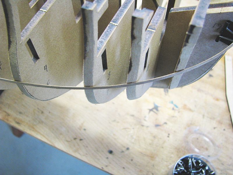 Po przyklejeniu obu odbojnikow (idealnie symetrycznie z obu burt, bez zadnych widocznych nienaturalnych zagiec ku gorze czy dolowi, plynnie od dziobu do rufy), musisz teraz podzielic cala szerokosc kazdej z burt na kilka (trzy czy cztery) przestrzenie - w angielskim zargonie to sie nazywa belts (pasy?), ktore nastepnie bedziesz sukcesywnie wypelnial plankami. Zmierz na najbardziej pekatej wredze (grodzi) w srodokreciu odcinek miedzy dolna krawedzia biegnacego tam odbojnika (wale) a gorna krawiedzia kilu i podziel go na trzy czy cztery jednakowej dlugosci odcinki. Zaznacz olowkiem te odcinki na krawedzi tej grodzi. Zrob to samo na krawedziach grodzi przy dziobie i rufie. Teraz tymczasowo poprzyklejaj do kazdej grodzi cieniutkie listeweczki (np. o przekroju 1x1 mm) - tzw. battens na zaznaczonych olowkiem punktach, ale tak by biegly one wzdluz calego kadluba plynnie, lagodnym lukiem opadajac od dziobu ku srodokreciu i dalej wznoszac sie lagodnie ku rufie. Zrob to samo na drugiej burcie, upewniwszy sie, by wszystkie listeweczki biegly idealnie symetrycznie na obu burtach, na dziobie i rufie zbiegajac sie razem. Sprawdz okiem i zrob ewentualne korekty. Miedzy tymi listeweczkami masz te pasy (belts) do wypelniania ich plankami.