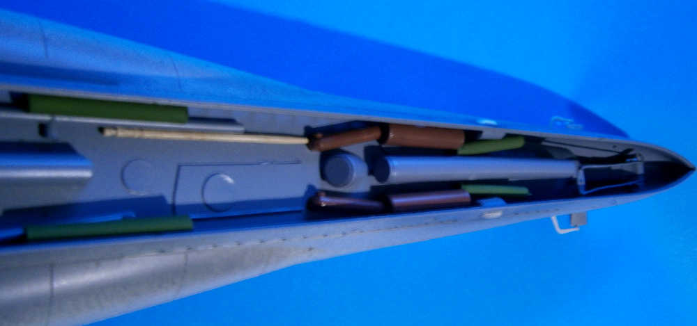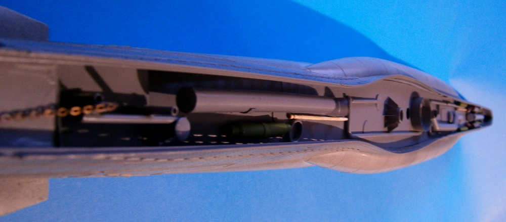 Ponadto dokonałem zasadniczego zewnętrznego malowania kadłuba w kamuflaż. Sam kamuflaż "Atlantik 3" - dwukolorowy, o prostych krawędziach plam, dosyć kontrastowy z trzecim odcieniem na pokładzie. Z zewnątrz wszystko pomalowałem farbami Revella przy użyciu aerografu.