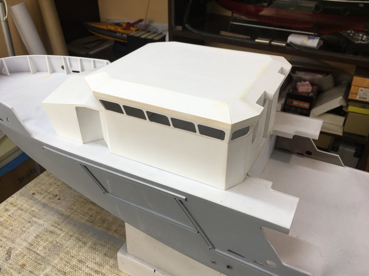 Pogoda za oknem paskudna za to sprzyja modelowaniu, walczę nadal z kadłubem, powierzchnia wyprowadzona jest już prawie na „glanc ”choć jeszcze sporo pracy zanim będzie gotowy pod malowanie. Wklejona listwa wzdłuż dziobu , wszelkiego rodzaju odpływy , wypływy , na rufie zrobiony slip do łodzi ratunkowej , pokłady główne tez już wklejone . Krzysiek Gdański wypalił mi przepięknie zamknięcia dennych studzienek poboru wody , jakość wypalenia w preszpanie jest rewelacyjna . Teraz przyjdzie czas na nadburcie oraz rant wokół pokładu oraz mocowania obijaczy na burtach.