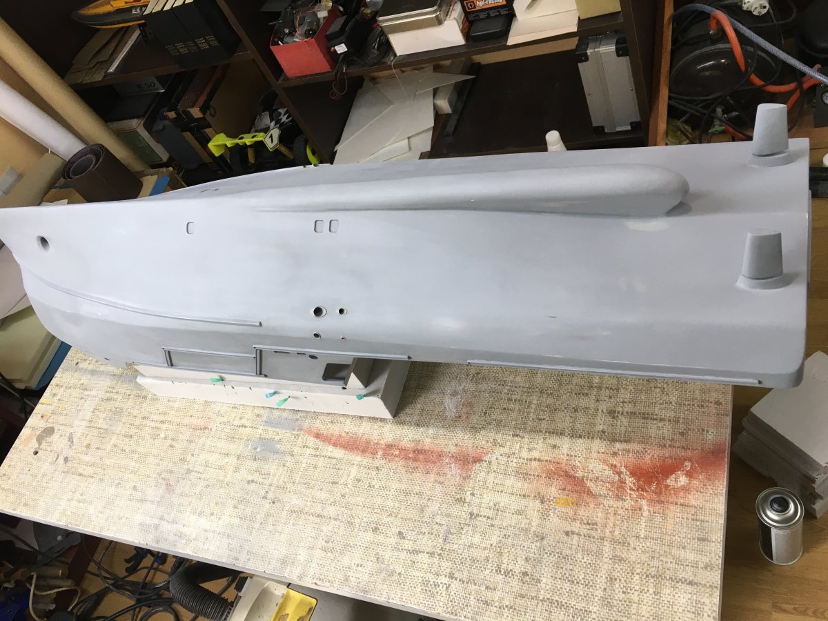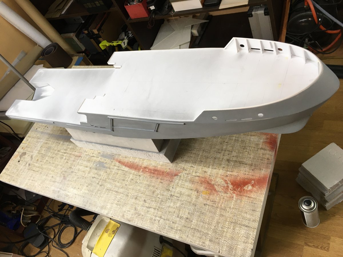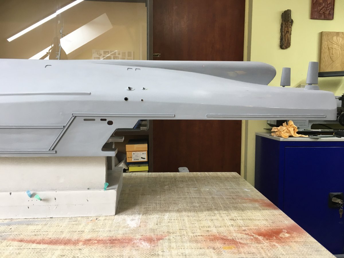 Pogoda za oknem paskudna za to sprzyja modelowaniu, walczę nadal z kadłubem, powierzchnia wyprowadzona jest już prawie na „glanc ”choć jeszcze sporo pracy zanim będzie gotowy pod malowanie. Wklejona listwa wzdłuż dziobu , wszelkiego rodzaju odpływy , wypływy , na rufie zrobiony slip do łodzi ratunkowej , pokłady główne tez już wklejone . Krzysiek Gdański wypalił mi przepięknie zamknięcia dennych studzienek poboru wody , jakość wypalenia w preszpanie jest rewelacyjna . Teraz przyjdzie czas na nadburcie oraz rant wokół pokładu oraz mocowania obijaczy na burtach.