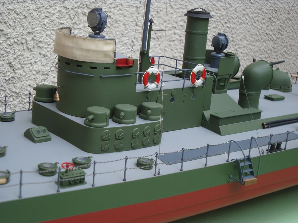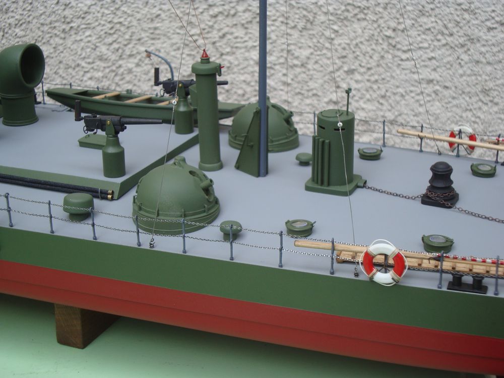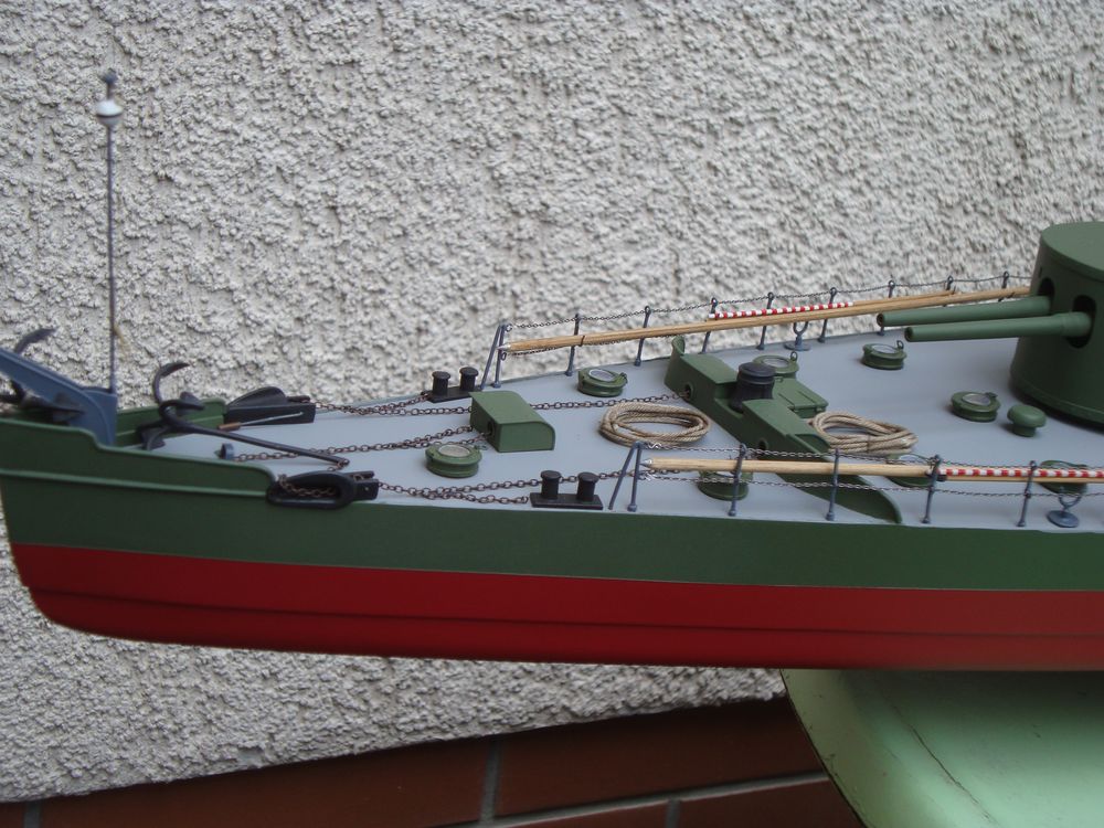 Model skończony .Niezbyt skomplikowany ale efektowny .Malowanie intuicyjne .Wydaje się że powinien być cały zielony .Chciałem uniknąć monotonii i wprowadziłem szare pokłady i elementy wyposażenia .Są monitory z tego okresu całe szare .Ciekawe są świetliki rozmieszczone na pokładzie .Co potem zobaczymy .PozdrR