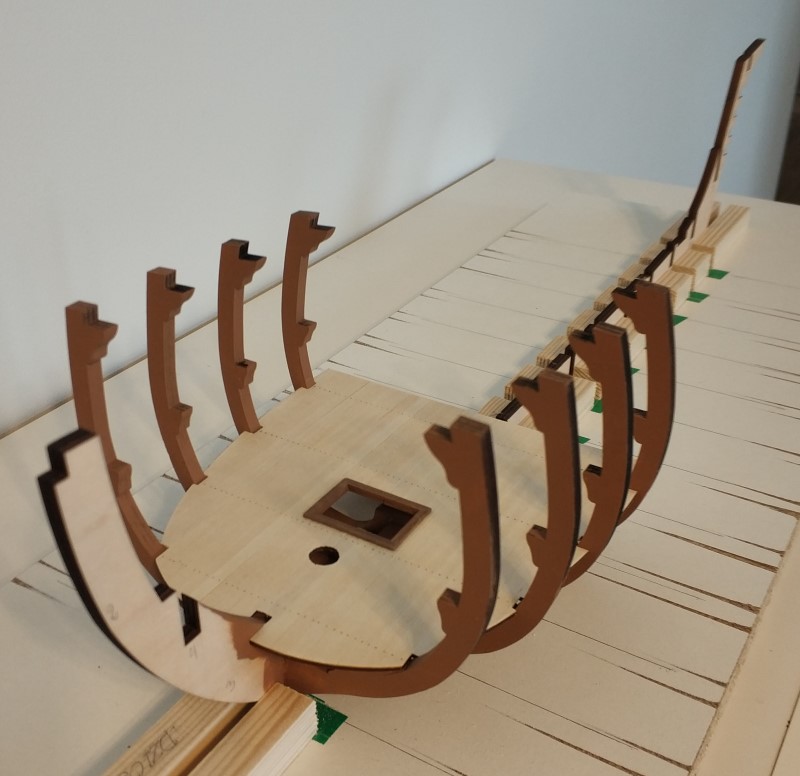 Kil, na skutek zapakowania elementów o różnej długości przy użyciu folii termokurczliwej, okazał się nieco zwichrowany. Wręgi dosyć luźno "latały" we wcięciach na kilu. Konieczne stało się więc zbudowanie prostej stoczni, żeby naprawić niedoróbki producenta.