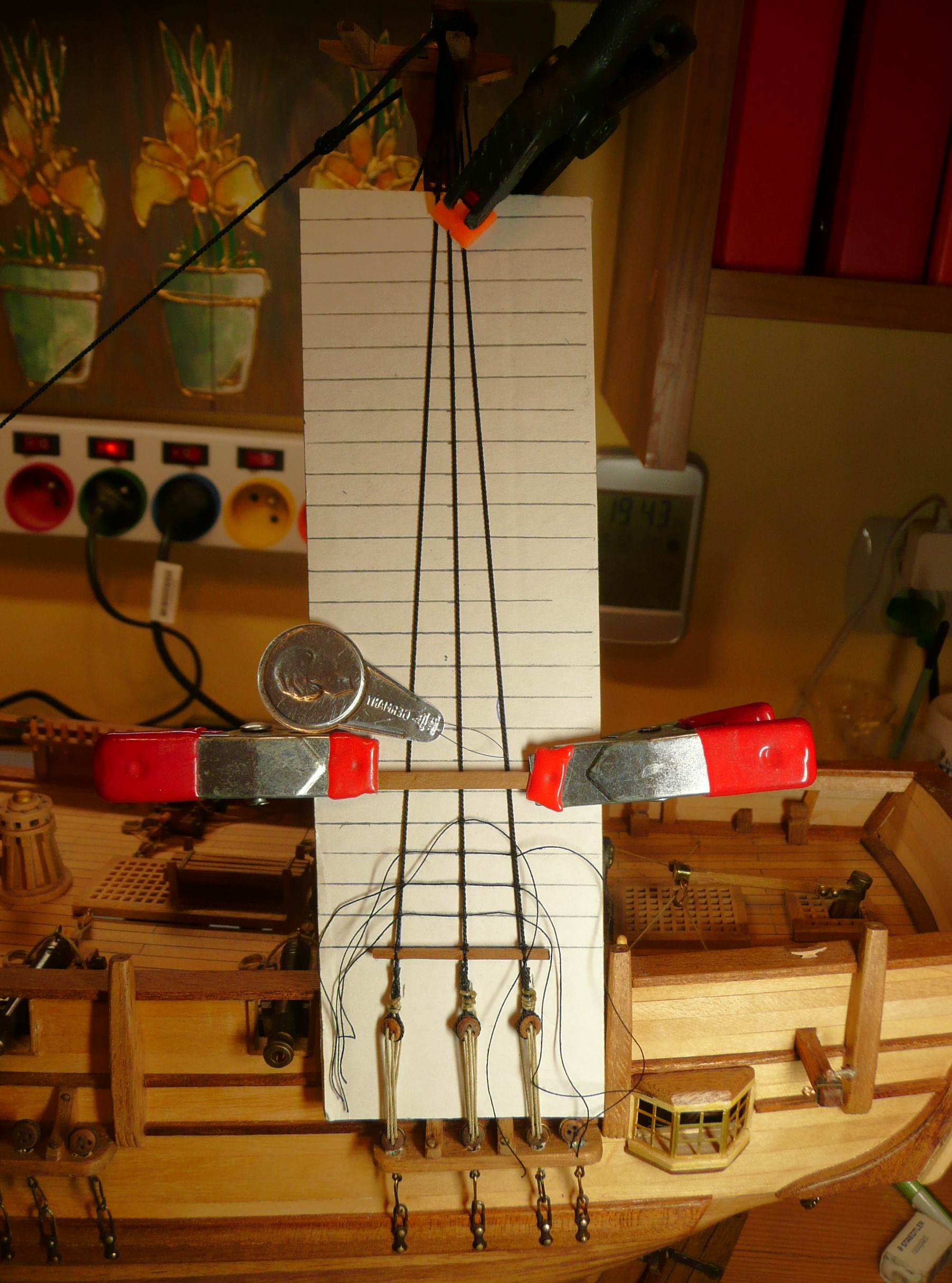 Polecam tez zrobienie sobie z duzych igiel zamocowanych na przedluzkach drewnianych (trzonki od np. starych pedzelkow), kilku narzedzi do wiazania linek, jak na zalaczniku - sa one niezastapione w tej pracy i ulatwiaja dojscie w glab kadluba, w ta "pajeczyne" linek.