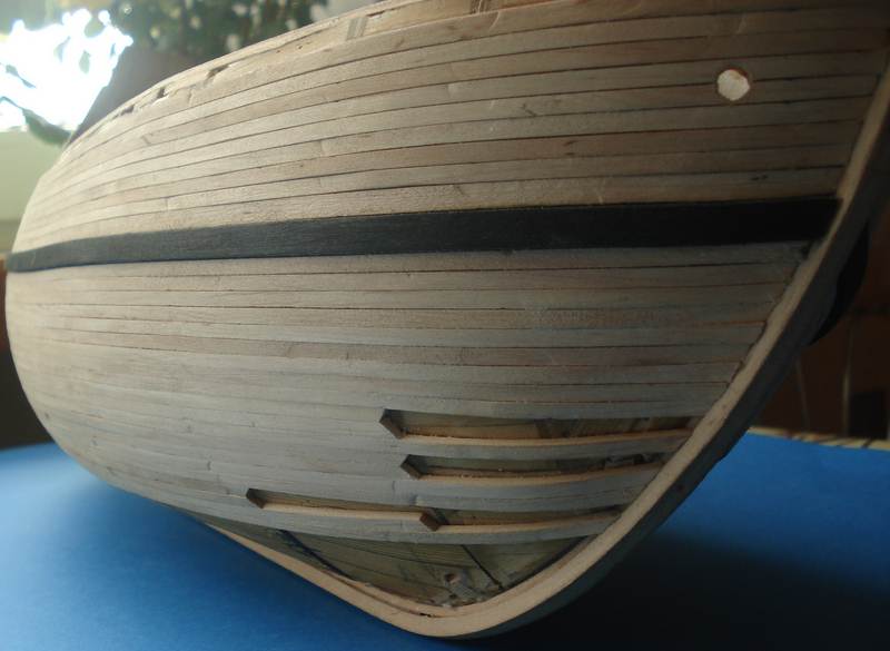 Witam. Powoli zaczynam brać się za wklejanie pokładów i przymiarek do poszycia. Zacząłem od listw odbojowych, po dwie z każdej burty. W sumie ten galeon ma 4 na każdej burcie lecz ja dałem na razie po dwie sztuki, listewki są tymczasowe, przyczepione(przybite na gwoździki). Zacząłem od tych listewek z tego względu żeby w miarę dokładnie rozmieścić otwory furt działowych, no a potem pomogą w układaniu poszycia.
