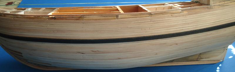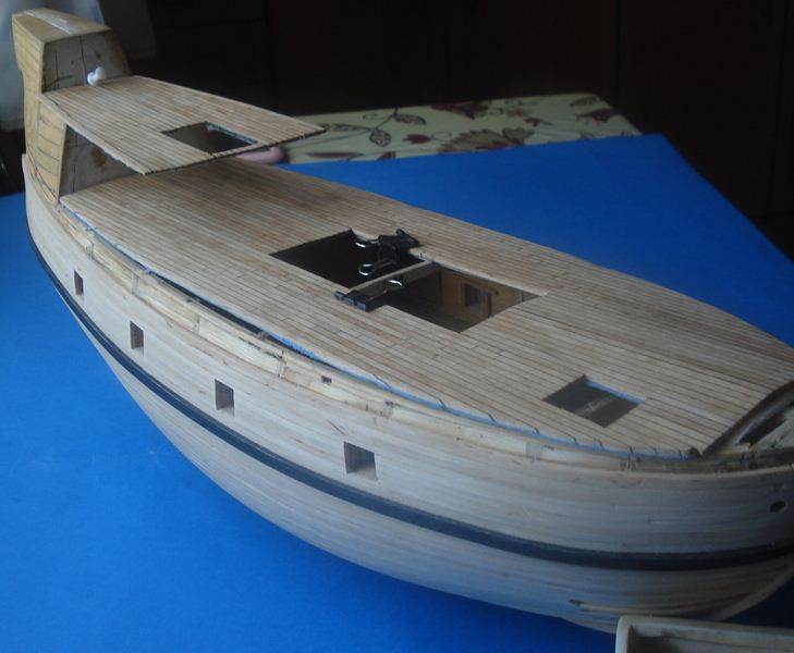 Zacząłem pokład, listewki 3mm a między nimi czarny papier ta metoda jest ok. Pokład będzie ze spadkiem tak jak powinno być w oryginale - skorzystałem z programu Adama w którym podaje się długość pokładu w danym miejscu a drukara drukuję gotowy łuk, dobra rzecz nie trzeba tańcować z cyrklem. Trochę miałem przebłysków z pasowaniem pokładu na śródokręciu, z jednej strony przybrakło mi 2mm- pokład nie zgrywał się z burtą musiałem zerwać 3 górne listwy poszycia i przeszlifować – i jest ok. Niestety pokłady nie wyszły tak jak chciałem zrobię je jeszcze raz. Muszę kupić jakiś lakier bezbarwny matowy żeby nie ściemniał mi tak ostro drewna jak pokost.