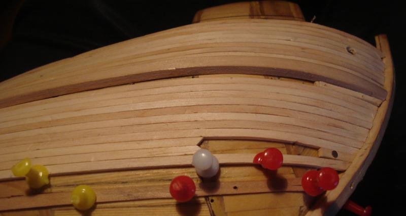 Witam. Powoli zaczynam brać się za wklejanie pokładów i przymiarek do poszycia. Zacząłem od listw odbojowych, po dwie z każdej burty. W sumie ten galeon ma 4 na każdej burcie lecz ja dałem na razie po dwie sztuki, listewki są tymczasowe, przyczepione(przybite na gwoździki). Zacząłem od tych listewek z tego względu żeby w miarę dokładnie rozmieścić otwory furt działowych, no a potem pomogą w układaniu poszycia.