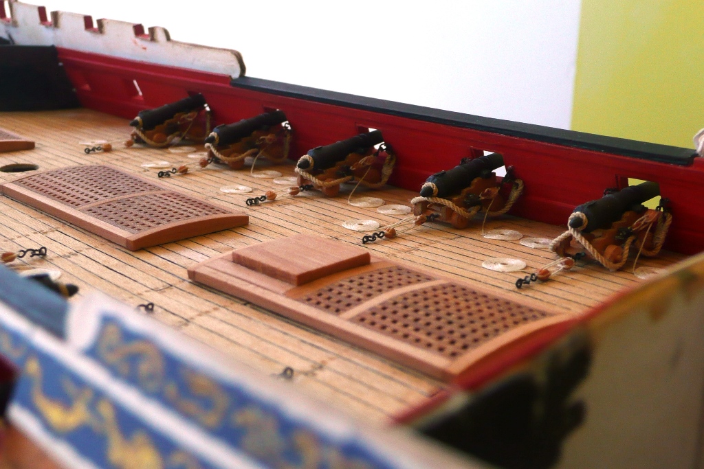 Zrobiłem nowe grettingi. Na jednej burcie zostały również skończone lawety. Grettingi są na razie przymierzone.Obecnie pracuję nad kabestanem i tu mam dylemat czy malować na czerwono, czy zostawić w kolorze drewna?