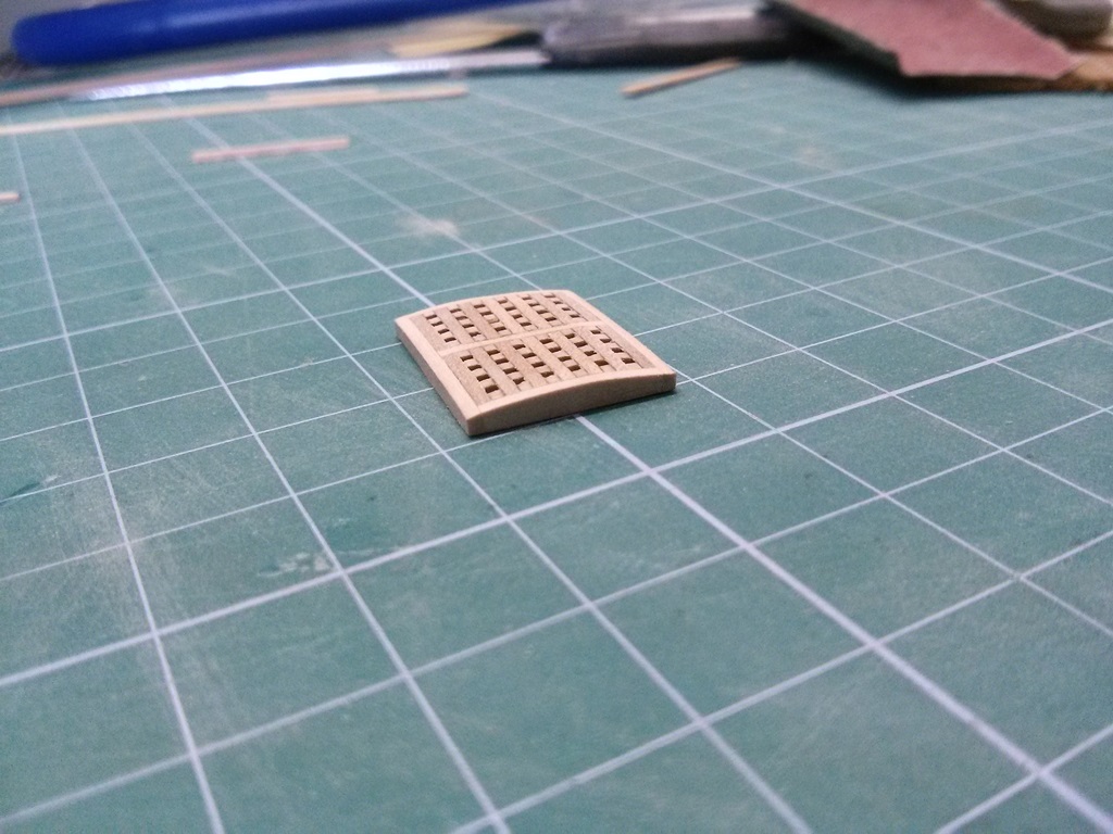 Troszkę wolnego było więc wypadało popracować przy modelu. Zrobiłem grettingi pokładu dziobowego. Łukowaty gretting wykonuję w ten sposób:
