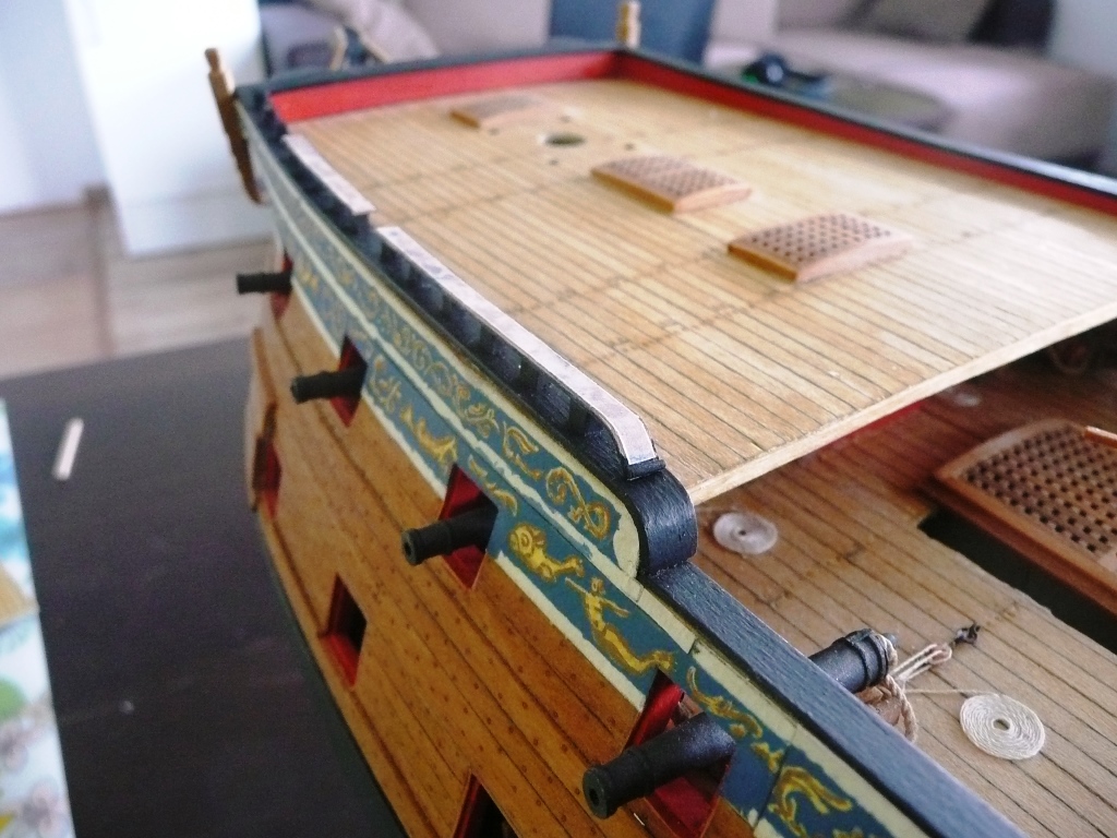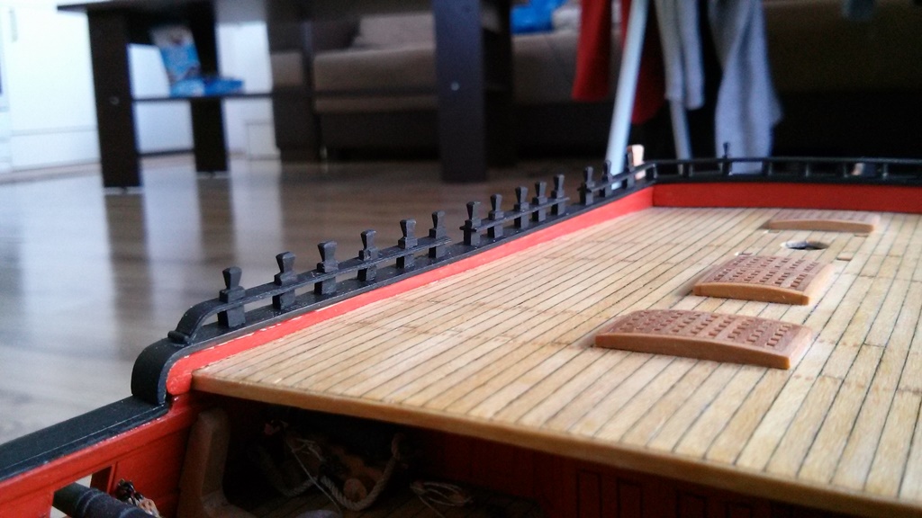 Dokończyłem pracę przy pokładzie dziobowym póki co. Monotonne było rzeźbienie tych pachołków, ale jakoś poszło. teraz w kolejce jest galeria rufowa, zobaczymy co z tego wyjdzie