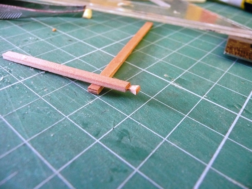 Pracę przeniosłem na dziób. Postanowiłem zrobić relingi. Materiał to grusza - listewki na pachołki, fornir na poręcz: