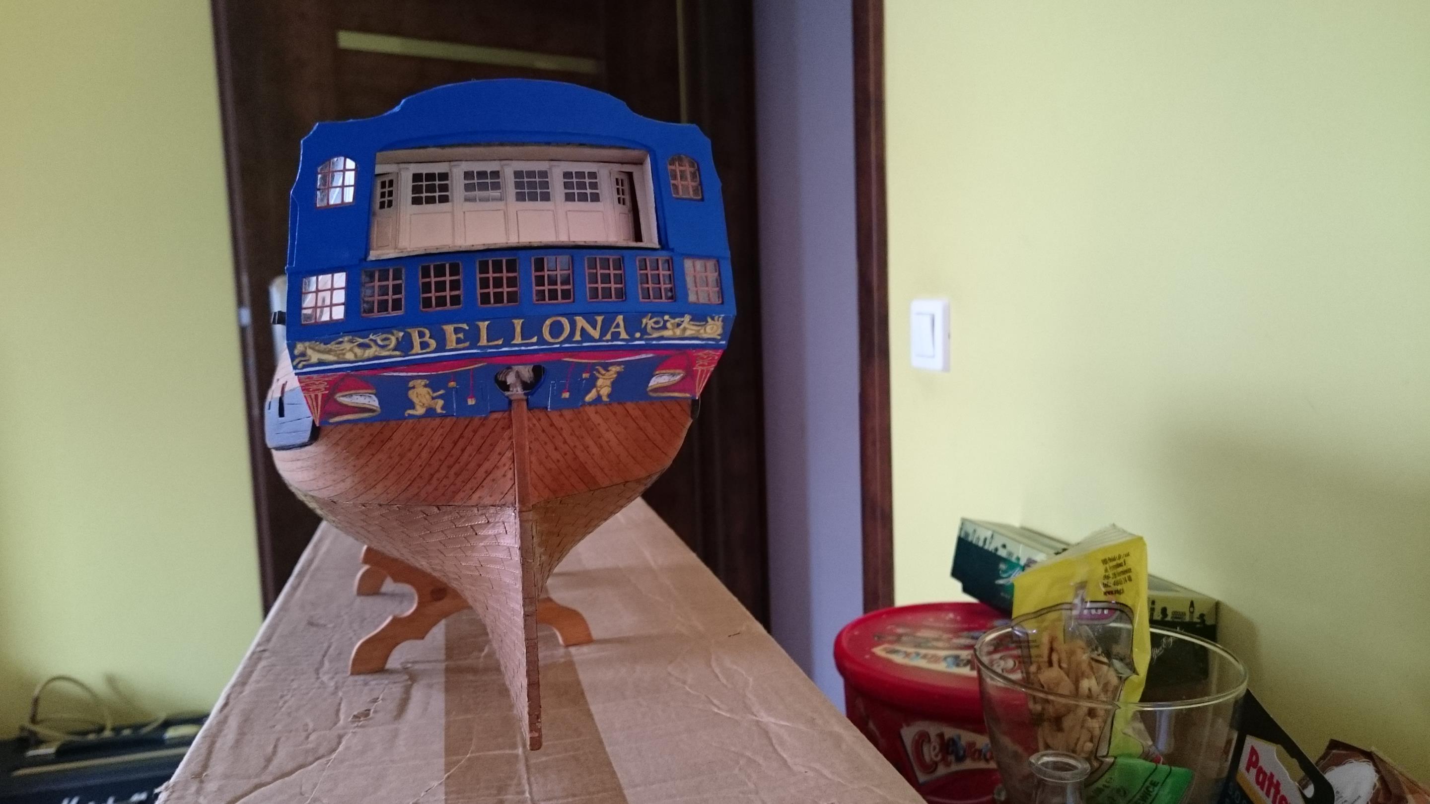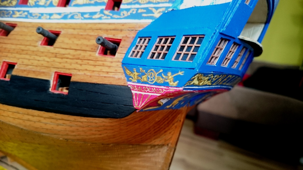Zrobiłem wszystkie okienka galerii rufowej. Wykorzystałem do tego fornir 0.6 mm z gruszy. Następnie wykonałem lustro rufy i przykleiłem do modelu. Obecny stan modelu jak na zdjęciach.