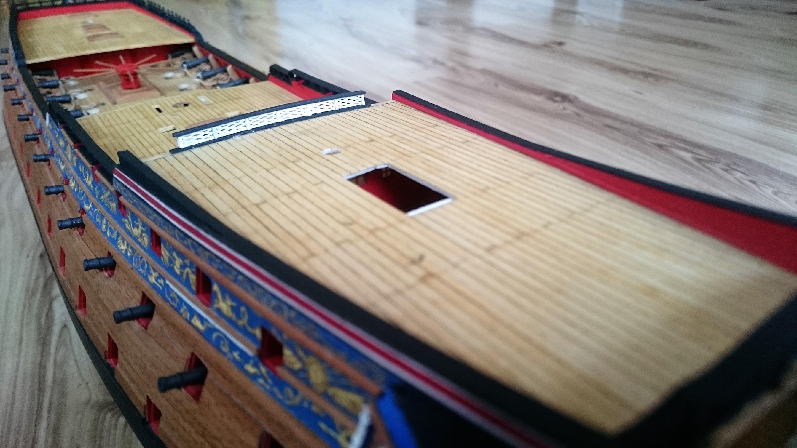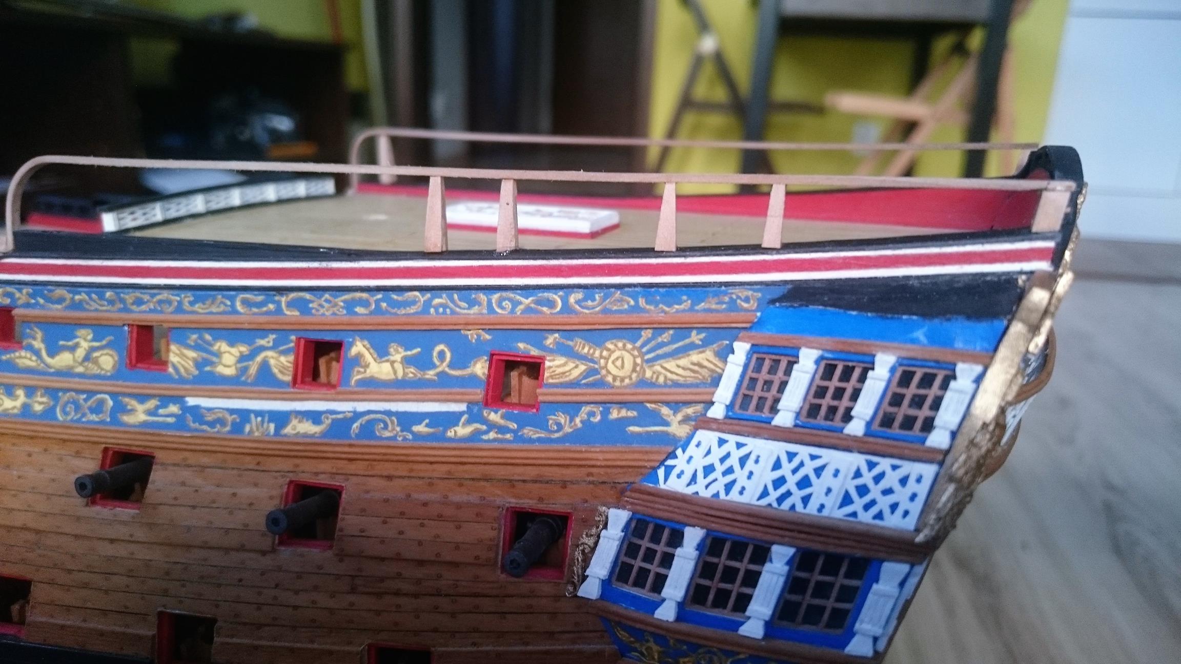 Skończyłem burty. Do zrobienia zostaną tylko relingi, ale to później, po montażu steru. Zrobiłem dodatkowo barierkę na najwyższym pokładzie oraz na rufie.