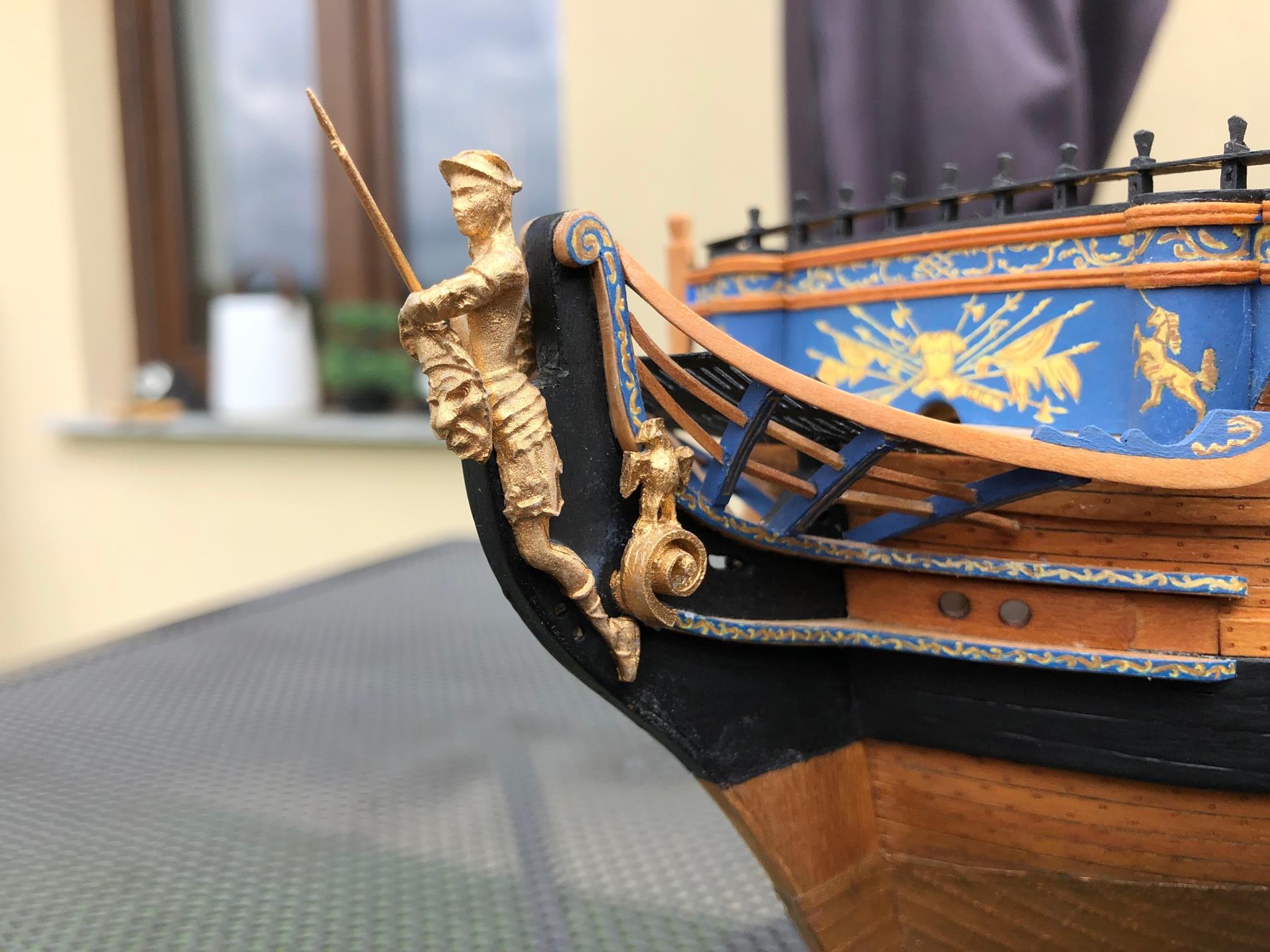 Prace przeniosły się na dziób okrętu. Doszła rzeźba. Paniusia włócznie ma wyjmowaną, bo pewnie nie raz by się złamała do końca budowy.